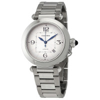 Silver-tone stainless steel case and bracelet. Fixed silver-tone stainless steel bezel. Silver dial with blue hands and index hour markers. Arabic numerals appear at the 3, 6, 9 and 12 o'clock positions. Minute markers around an inner ring. Dial Type: Analog. Date display between the 4 and 5 o'clock positions. Cartier Calibre 1847 MC Automatic movement, containing 23 Jewels, bitting at 28800 vph, and has a power reserve of approximately 42 hours. Scratch resistant sapphire crystal. Screw down crown. Transparent case back. Round case shape, case size: 41 mm, case thickness: 9.55 mm. Band width: 22 mm. Deployment clasp. Water resistant at 100 meters / 330 feet. Functions: date, hour, minute, second. Pasha Series. Luxury watch style. Watch label: Swiss Made. Pre-owned Cartier Pasha Automatic Silver Dial Men's Watch WSPA0009. GENERAL Collection Name: Pasha INFORMATION Brand: Cartier Series: Pasha Model: WSPA0009 Gender: Mens Watch Label: Swiss Made Movement: Automatic Engine: Cartier Calibre 1847 MC Power Reserve: 42 hours CONDITION INFORMATION Box: Yes Preowned Item Condition: Excellent Papers: Yes Year: 2023 Comments: Includes manual, carter care booklet, tool. CASE Case Size: 41 mm Case Thickness: 9.55 mm Case Material: Stainless Steel Case Shape: Round Case Back: Transparent DIAL Type: Analog Dial Color: Silver Crystal: Scratch Resistant Sapphire Hands: Blue Second Markers: Arabic Numerals appear at the 3, 6, 9 and 12 o'clock positions. Minute Markers around an inner ring Dial Markers: Index Bezel: Fixed Bezel Color: Silver-tone Bezel Material: Stainless Steel Crown: Screw Down BAND Band Type: Bracelet Band Material: Stainless Steel Band Color: Silver-tone Band Width: 22 mm Clasp: Deployment FEATURES Water Resistance: 100 meters / 330 feet Calendar: Date display between the 4 and 5 o'clock positions Functions: Date, Hour, Minute, Second Watch Features: Stainless Steel, Analog ADDITIONAL INFO Watch Style: Luxury Warranty: 1 Year Jomashop Warranty Jomashop Sku: PRE-Z-CRTWSPA0009 Department: Watches Category: Watches
