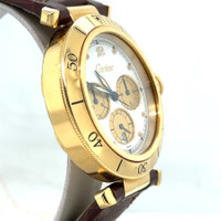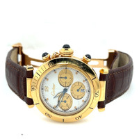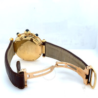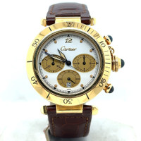 Yellow gold-tone 18kt yellow gold case with a brown leather strap. Fixed yellow gold-tone 18kt yellow gold bezel. White dial with luminous hands and index hour markers. Minute markers around the outer rim. Dial Type: Analog. Luminescent hands and markers. Date display between 4 and 5 o'clock position. Chronograph - three sub-dials displaying: 60 second, 30 minute and 12 hour. Cartier Calibre 7101 quartz movement. Scratch resistant sapphire crystal. Pull / push crown. Solid case back. Round case shape, case size: 37 mm, case thickness: 10 mm. Band width: 20 mm. Fold over clasp. Water resistant at 100 meters / 330 feet. Functions: chronograph, date, hour, minute, second. Pasha De Cartier Series. Luxury watch style. Watch label: Swiss Made. Pre-owned Cartier Pasha de Cartier Chronograph Quartz White Dial Ladies Watch WJ130009. GENERAL Collection Name: Pasha de Cartier INFORMATION Brand: Cartier Series: Pasha De Cartier Model: WJ130009 Gender: Womens Watch Label: Swiss Made Movement: Quartz Engine: Cartier Calibre 7101 CONDITION INFORMATION Box: No Preowned Item Condition: Excellent Papers: No Year: 1992 CASE Case Size: 37 mm Case Thickness: 10 mm Case Material: 18kt Yellow Gold Case Shape: Round Case Back: Solid DIAL Type: Analog Dial Color: White Crystal: Scratch Resistant Sapphire Hands: Luminous Second Markers: Minute markers around the outer rim Dial Markers: Index Sub Dials: Three - 60 Second, 30 Minute and 12 Hour Luminiscence: Hands and Markers Bezel: Fixed Bezel Color: Yellow Gold-tone Bezel Material: 18kt Yellow Gold Crown: Pull / Push BAND Band Type: Strap Band Material: Leather Band Color: Brown Band Width: 20 mm Clasp: Fold Over FEATURES Water Resistance: 100 meters / 330 feet Calendar: Date display between 4 and 5 o'clock position Functions: Chronograph, Date, Hour, Minute, Second Watch Features: Chronograph, Leather, Gold, Analog ADDITIONAL INFO Watch Style: Luxury Warranty: 1 Year Jomashop Warranty Jomashop Sku: PRE-P-CRT76662 Department: Watches Category: Watches