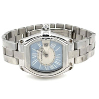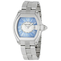 Pre-owned Stainless steel case with a stainless steel bracelet. Light blue and white dial with luminous hands and Roman numeral hour markers. Date displays at the 3 o'clock position. Scratch resistant sapphire crystal. Quartz movement. Case diameter 30 mm. Case thickness: 9 mm. Fold-through buckle deployment clasp. Water resistant at 100 meters (330 feet). Cartier Roadster Ladies Watch W62053V3 GENERAL Collection Name: Roadster INFORMATION Brand: Cartier Series: Roadster Model: W62053V3 Gender: Womens Watch Label: Swiss Made Movement: Quartz Engine: Cartier Calibre 688 CONDITION INFORMATION Box: No Preowned Item Condition: Excellent Papers: No CASE Case Size: 30 mm Case Thickness: 9 mm Case Material: Stainless Steel Case Shape: Tonneau Case Back: Solid Stainless Steel DIAL Type: Analog Dial Color: Blue and White Crystal: Scratch Resistant Sapphire Hands: Luminous White Dial Markers: White Roman Bezel: Fixed Bezel Color: Silver-tone Bezel Material: Stainless Steel Crown: Screw Down BAND Band Type: Bracelet Band Material: Stainless Steel Band Color: Silver-tone Clasp: Fold-through Deployment FEATURES Water Resistance: 100 meters / 330 feet Calendar: Date display at the 3 o'clock position Functions: Date, Hour, Minute Watch Features: Stainless Steel, Analog ADDITIONAL INFO Watch Style: Fashion Warranty: 1 Year Jomashop Warranty UPC Code: 7612456349768 Additional Info: Date Displays At 3 O'clock Position Jomashop Sku: PRE-P-CRT84399 Department: Watches