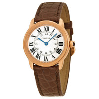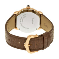 Pre-owned 18kt pink gold case with a brown (alligator) leather strap. Fixed 18kt pink gold bezel. Silver dial with blued-steel sword-shaped hands and black Roman numeral hour markers. 24-hour markings. Minute markers around an inner ring. Dial Type: Analog. Quartz movement. Scratch resistant sapphire crystal. Pull / push crown set with a synthetic cabochon. Solid case back. Round case shape. Case size: 29.5 mm. Case thickness: 6.35 mm. Tang clasp. Water resistant at 30 meters / 100 feet. Functions: hour, minute. Luxury watch style. Watch label: Swiss Made. Cartier Ronde Solo De Cartier Silver Dial Ladies Watch W6701007. GENERAL Collection Name: Ronde Solo De Cartier INFORMATION Brand: Cartier Series: Ronde Solo De Cartier Model: W6701007 Gender: Womens Watch Label: Swiss Made Movement: Quartz CONDITION INFORMATION Box: Yes Preowned Item Condition: Excellent Papers: No Comments: The watch is near mint condition, with no visible scratches to the naked eye, but may have some tiny scratches under very close-up inspection. The watch strap shows some light signs of wear, please view detailed images. The total weight of the watch is 43 grams. The watch comes in a traveling case with an instructions booklet and a stamped certificate page. The watch passed the water pressure test and we will include the printout of the test results. The quartz movement keeps perfect time. Fits CASE Case Size: 29.5 mm Case Thickness: 6.35 mm Case Material: 18kt Pink Gold Case Shape: Round Case Back: Solid DIAL Type: Analog Dial Color: Silver Crystal: Scratch Resistant Sapphire Hands: Blued-steel Sword-shaped Second Markers: 24-Hour Markings. Minute Markers around an inner ring Dial Markers: Black Roman Numeral Bezel: Fixed Bezel Material: 18kt Pink Gold Crown: Pull / Push set with a Synthetic Cabochon BAND Band Type: Strap Band Material: Leather Band Color: Brown Band Length: 7 inches Clasp: Tang FEATURES Water Resistance: 30 meters / 100 feet Functions: Hour, Minute Watch Features: Leather, Gold, Analog, Alligator Leather ADDITIONAL INFO Watch Style: Luxury Warranty: 1 Year Jomashop Warranty UPC Code: 7612456740947 Jomashop Sku: PRE-P-CRT78288 Department: Watches Category: Watches