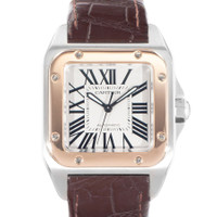 Silver-tone stainless steel case with a brown leather strap. Fixed rose gold-tone 18kt rose gold bezel. Silver-tone dial with black hands and Roman numeral hour markers. Minute scale around the inner rim. Dial Type: Analog. Luminescent hands. Cartier Calibre 049 Automatic movement, based upon ETA 2892-A2, containing 21 Jewels, bitting at 28800 vph, and has a power reserve of approximately 42 hours. Scratch resistant sapphire crystal. Cabochon crown. Solid case back. Square case shape, case size: 33 mm. Deployment with push button release clasp. Water resistant at 100 meters / 330 feet. Functions: hour, minute, second. Santos 100 Series. Luxury watch style. Watch label: Swiss Made. Item Variations: 2878, W20107X7, Cartier-W20107X7. Pre-owned Cartier Santos 100 Automatic Silver Dial Men's Watch W20107X7. GENERAL Year: Circa 2013 Comments: This Cartier Santos 100, reference number W20107X7 2878, has a manufacturer year of Circa 2013. Box not included, Papers not included . This watch has a 33mm Steel & Rose Gold Case with Rose gold bezel, Silver Roman numerals dial and Leather bracelet with Double-fold clasp. The Automatic movement has Time Only function. The wrist measures 7 inches or 17.78 centimeters. The condition is Very Good The watch listed is in stock and the pictures shown are of the actual watch for sale. All of our wat Preowned Item Condition: Very Good CASE Case Material: Stainless Steel Case Shape: Square Case Back: Solid BAND Band Material: Leather Band Type: Strap Band Color: Brown Clasp: Deployment with Push Button Release DIAL Dial Color: Silver-tone Type: Analog Crystal: Scratch Resistant Sapphire Hands: Black Dial Markers: Roman Numeral Second Markers: Minute Scale around the inner rim Luminiscence: Hands Bezel: Fixed Bezel Color: Rose Gold-tone Bezel Material: 18kt Rose Gold Crown: Cabochon INFORMATION Brand: Cartier Series: Santos Collection Name: Santos 100 Gender: Mens Model: W20107X7 Watch Label: Swiss Made Movement: Automatic Engine: Cartier Calibre 049 Power Reserve: 42 hours FEATURES Water Resistance: 100 meters / 330 feet Functions: Hour, Minute, Second Watch Features: Stainless Steel, Leather, Gold, Analog ADDITIONAL INFO Watch Style: Luxury Warranty: 1 Year Jomashop Warranty Jomashop Sku: PRE-P-CRT103674 Item Variation: 2878, W20107X7, Cartier-W20107X7 Department: Watches Category: Watches
