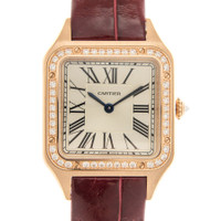 Rose gold-tone 18kt rose gold case with a red (alligator) leather strap. Fixed rose gold-tone 18kt rose gold set with diamonds bezel. Silver dial with blued-steel sword-shaped hands and Roman numeral hour markers. Minute markers around the outer rim. Dial Type: Analog. Quartz movement. Scratch resistant sapphire crystal. Pull / push crown. Solid case back. Square case shape, case size: 27.5 mm x 38 mm, case thickness: 7.3 mm. Tang clasp. Water resistant at 30 meters / 100 feet. Functions: hour, minute. Santos Series. Luxury watch style. Watch label: Swiss Made. Pre-owned Cartier Santos Diamond Silver Dial Ladies Watch WJSA0017. GENERAL Preowned Item Condition: Mint CASE Case Thickness: 7.3 mm Case Material: 18kt Rose Gold Case Shape: Square Case Back: Solid BAND Band Material: (Alligator) Leather Band Type: Strap Band Color: Red Clasp: Tang DIAL Dial Color: Silver Type: Analog Crystal: Scratch Resistant Sapphire Hands: Blued-steel Sword-shaped Dial Markers: Roman Numeral Second Markers: Minute Markers around the outer rim Bezel: Fixed Bezel Color: Rose Gold-tone Bezel Material: 18kt Rose Gold set with Diamonds Crown: Pull / Push INFORMATION Brand: Cartier Series: Santos Collection Name: Santos Gender: Womens Model: WJSA0017 Watch Label: Swiss Made Movement: Quartz FEATURES Water Resistance: 30 meters / 100 feet Functions: Hour, Minute Watch Features: Diamond, Leather, Gold, Alligator Leather, Analog ADDITIONAL INFO Watch Style: Luxury Warranty: 1 Year Jomashop Warranty Jomashop Sku: PRE-P-CRT104019 Department: Watches Category: Watches