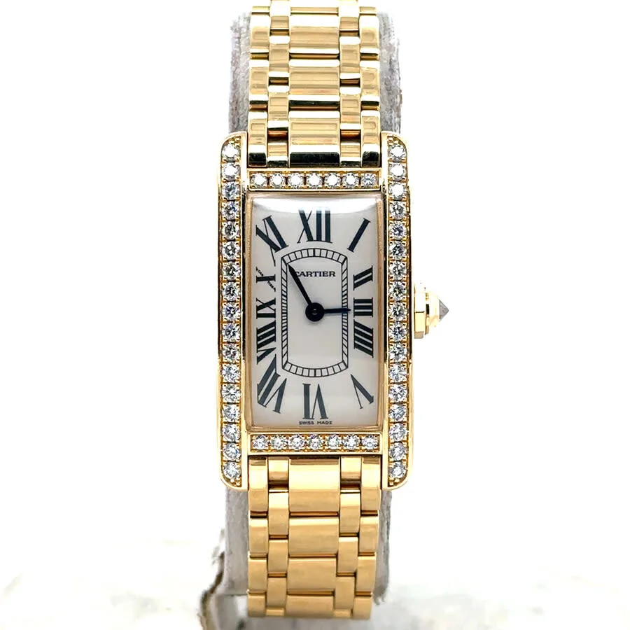 Yellow gold-tone 18kt yellow gold case and bracelet. Fixed yellow gold-tone bezel with diamond set 18kt yellow gold. Silver-tone dial with blued-steel sword-shaped hands and Roman numeral hour markers. Minute scale around the inner rim. Dial Type: Analog. Quartz movement. Scratch resistant sapphire crystal. Pull / push crown. Solid case back. Rectangle case shape, case size: 19 mm, case thickness: 7 mm. Band width: 13 mm. Hidden clasp. Water resistant at 30 meters / 100 feet. Functions: hour, minute. Tank Americaine Series. Luxury watch style. Watch label: Swiss Made. Pre-owned Cartier Tank Americaine Quartz Diamond Silver Dial Ladies Watch 2482. GENERAL Comments: WEIGHS 80.8 GRAMS & FITS UP TO 7.25 INCH WRIST Preowned Item Condition: Excellent CASE Case Thickness: 7 mm Case Material: 18kt Yellow Gold Case Shape: Rectangle Case Back: Solid BAND Band Material: 18kt Yellow Gold Band Type: Bracelet Band Color: Yellow Gold-tone Band Width: 13 mm Clasp: Hidden DIAL Dial Color: Silver-tone Type: Analog Crystal: Scratch Resistant Sapphire Hands: Blued-steel Sword-shaped Dial Markers: Roman Numeral Second Markers: Minute Scale around the inner rim Bezel: Fixed Bezel Color: Yellow Gold-tone Bezel Material: Diamond Set 18kt Yellow Gold Crown: Pull / Push INFORMATION Brand: Cartier Series: Tank Collection Name: Tank Americaine Gender: Womens Model: 2482 Watch Label: Swiss Made Movement: Quartz FEATURES Water Resistance: 30 meters / 100 feet Functions: Hour, Minute Watch Features: Analog, Gold, Diamond ADDITIONAL INFO Watch Style: Luxury Warranty: 1 Year Jomashop Warranty Jomashop Sku: PRE-P-CRT105000 Department: Watches