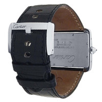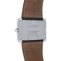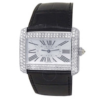 18kt white gold case with a black leather strap. Fixed bezel with diamond set 18kt white gold. Silver-tone dial with blued-steel sword-shaped hands and Roman numeral hour markers. Dial Type: Analog. Quartz movement. Scratch resistant sapphire crystal. Solid case back. Rectangle case shape, case size: 38 mm. Buckle clasp. Water resistant at 30 meters / 100 feet. Functions: hour, minute. Tank Divan Series. Dress watch style. Watch label: Swiss Made. Pre-owned Cartier Tank Divan Quartz Diamond Silver Dial Men's Watch WA301356. GENERAL Collection Name: Tank Divan INFORMATION Brand: Cartier Series: Tank Model: WA301356 Gender: Mens Watch Label: Swiss Made Movement: Quartz CONDITION INFORMATION Box: No Preowned Item Condition: Good Papers: No CASE Case Size: 38 Case Material: 18kt White Gold Case Shape: Rectangle Case Back: Solid DIAL Type: Analog Dial Color: Silver-tone Crystal: Scratch Resistant Sapphire Hands: Blued-steel Sword-shaped Dial Markers: Roman Numeral Bezel: Fixed Bezel Material: Diamond Set 18kt White Gold BAND Band Type: Strap Band Material: Leather Band Color: Black Clasp: Buckle FEATURES Water Resistance: 30 meters / 100 feet Functions: Hour, Minute Watch Features: Analog, Gold, Leather, Diamond ADDITIONAL INFO Watch Style: Dress Warranty: 1 Year Jomashop Warranty Jomashop Sku: PRE-P-CRT96306 Department: Watches