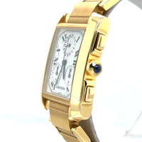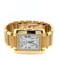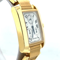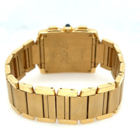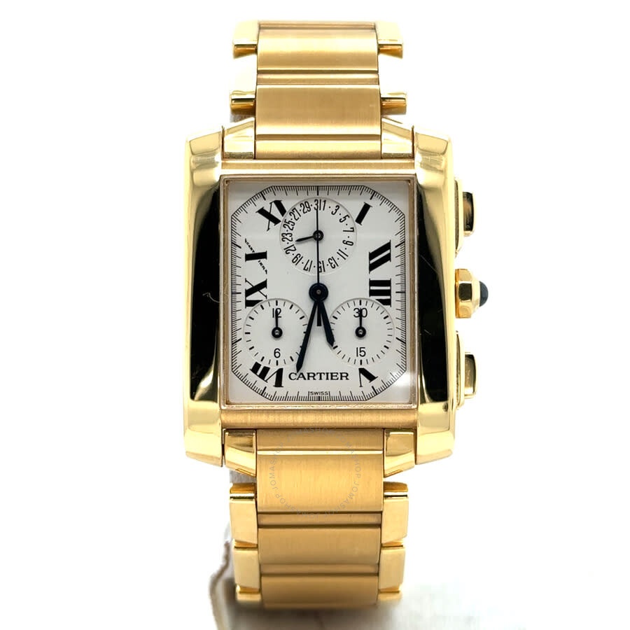 Yellow gold-tone 18kt yellow gold case and bracelet. Fixed yellow gold-tone 18kt yellow gold bezel. Silver-tone dial with blued-steel sword-shaped hands and Roman numeral hour markers. Minute markers around the outer rim. Dial Type: Analog. Date display at the 12 o'clock position. Quartz movement. Scratch resistant sapphire crystal. Cabochon crown. Solid case back. Rectangle case shape, case size: 28 mm, case thickness: 7 mm. Band width: 20 mm. Hidden clasp. Water resistant at 30 meters / 100 feet. Functions: hour, minute, second, date, chronograph. Tank Francaise Series. Luxury watch style. Watch label: Swiss Made. Pre-owned Cartier Tank Francaise Chronograph Quartz Silver Dial Men's Watch W50005R2. GENERAL Collection Name: Tank Francaise INFORMATION Brand: Cartier Series: Tank Model: W50005R2 Gender: Mens Watch Label: Swiss Made Movement: Quartz CONDITION INFORMATION Box: No Preowned Item Condition: Excellent Papers: No CASE Case Diameter: 28 mm Case Thickness: 7 mm Case Material: 18kt Yellow Gold Case Shape: Rectangle Case Back: Solid DIAL Type: Analog Dial Color: Silver-tone Crystal: Scratch Resistant Sapphire Hands: Blued-steel Sword-shaped Second Markers: Minute Markers around the outer rim Dial Markers: Roman Numeral Bezel: Fixed Bezel Color: Yellow Gold-tone Bezel Material: 18kt Yellow Gold Crown: Cabochon BAND Band Type: Bracelet Band Material: 18kt Yellow Gold Band Color: Yellow Gold-tone Band Width: 20 mm Clasp: Hidden FEATURES Water Resistance: 30 meters / 100 feet Calendar: Date display at the 12 o'clock position Functions: Hour, Minute, Second, Date, Chronograph Watch Features: Chronograph, Gold, Analog ADDITIONAL INFO Watch Style: Luxury Warranty: 1 Year Jomashop Warranty Jomashop Sku: PRE-P-CRT69378 Department: Watches Category: Watches