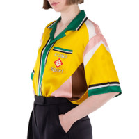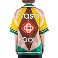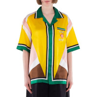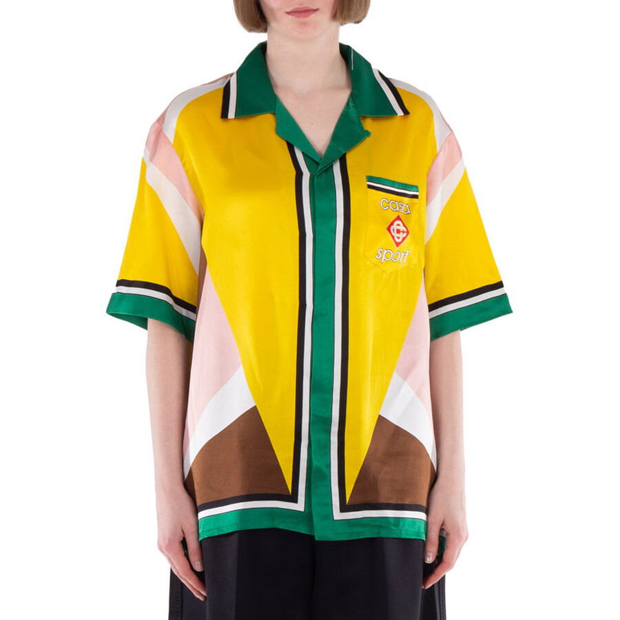 Brand: Casablanca. Fashion category: Casual Button-Downs. SKU: WS24-SH-003-12-GEOMETRIC CASA SPORT. Color: Yellow. Casablanca Casa Sport Silk Shirt. Crafted from luxurious silk satin fabric, this shirt features a breast pocket, button closure, and contrast stripe borders on the collar, cuffs, hem, and placket. It is finished with geometric color panels and the house's Casa Sport logo for a stylish, distinctive touch. 100% silk. Made in Italy. GENERAL Color: Yellow INFORMATION Brand: Casablanca Gender: Womens Model: WS24-SH-003-12-GEOMETRIC CASA SPORT DETAILS Category: Tops Apparel Type: Casual Button-Downs Material: Silk ADDITIONAL INFO Jomashop Sku: -2GEOMETRICCASASPORT Department: Clothing