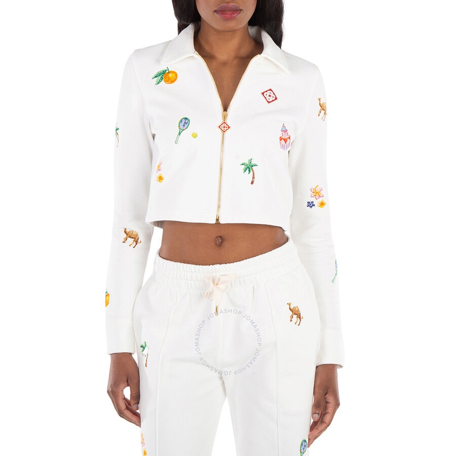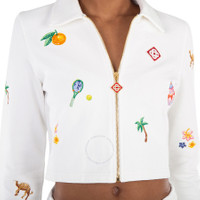 Casablanca Ladies Outerwear. Fashion category: Coats & Jackets. SKU: WPF24-JTP-26101-ELEMENTS EN CRAYON. Color: Elements En Crayon. Casablanca Elements En Crayon Cropped Jacket. This jacket is made from 100% cotton for a classic fit, featuring embroidered artwork that blends nature and architecture, a classic collar, long sleeves with ribbed cuffs, a straight cropped hem, unlined design, branded zip puller, and gold-tone hardware with a front zip fastening. 100% organic cotton. Made in Portugal. GENERAL Color: Elements En Crayon INFORMATION Brand: Casablanca Gender: Womens Model: WPF24-JTP-26101-ELEMENTS EN CRAYON DETAILS Category: Outerwear Apparel Type: Coats & Jackets Material: Cotton ADDITIONAL INFO Jomashop Sku: -101ELEMENTSENCRAYON Department: Clothing