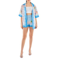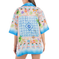 Casablanca Ladies Tops. Fashion category: Shirts & Blouses. SKU: WPF24-SH-003-03-LE PLONGEON. Color: Le Plongeon. Casablanca Ladies Le Plongeon Silk Shirt. This shirt, crafted from silk twill fabric, features a front button closure, a Cuban collar, and a breast pocket. It is detailed with contrast Memphis wave-inspired gradient stripes along the cuffs, collar, hem, and placket. 100% silk. GENERAL Color: Le Plongeon INFORMATION Brand: Casablanca Gender: Womens Model: WPF24-SH-003-03-LE PLONGEON DETAILS Category: Tops Apparel Type: Shirts & Blouses Material: Silk ADDITIONAL INFO Jomashop Sku: -24SH00303LEPLONGEON Department: Clothing