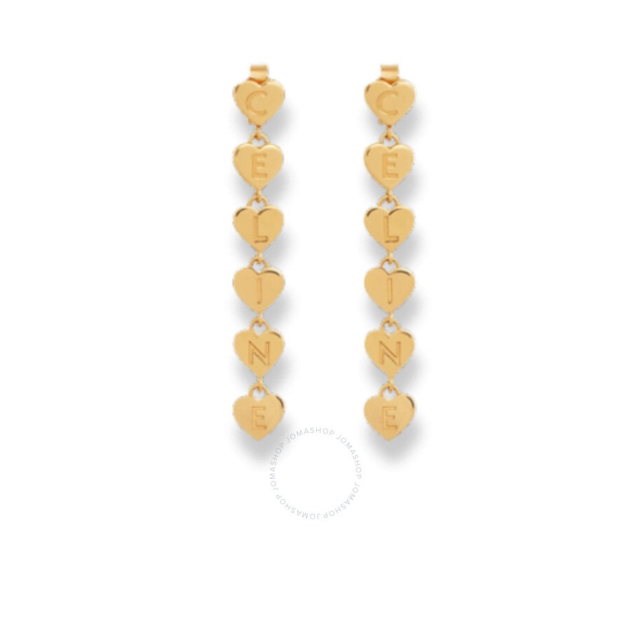 Celine Ladies Earrings. SKU: 460TE6BRA.35OR. Barcode: 3616900401686. Color: Gold. Metal Type: Brass. Celine Cœur Celine Heart Earrings in Brass with Gold Finish. Made from brass with a gold finish, each heart is engraved with a CELINE letter, collectively spelling out the brand's iconic name. Size - Total height: 3,3cm. GENERAL Brand Type: Designer Color: Gold INFORMATION Brand: Celine Gender: Womens Model: 460TE6BRA.35OR DETAILS Earrings: Drop/Dangle Material : Brass ADDITIONAL INFO UPC Code: 3616900401686 Jomashop Sku: Z-M4RRA Department: Jewelry Category: Earrings