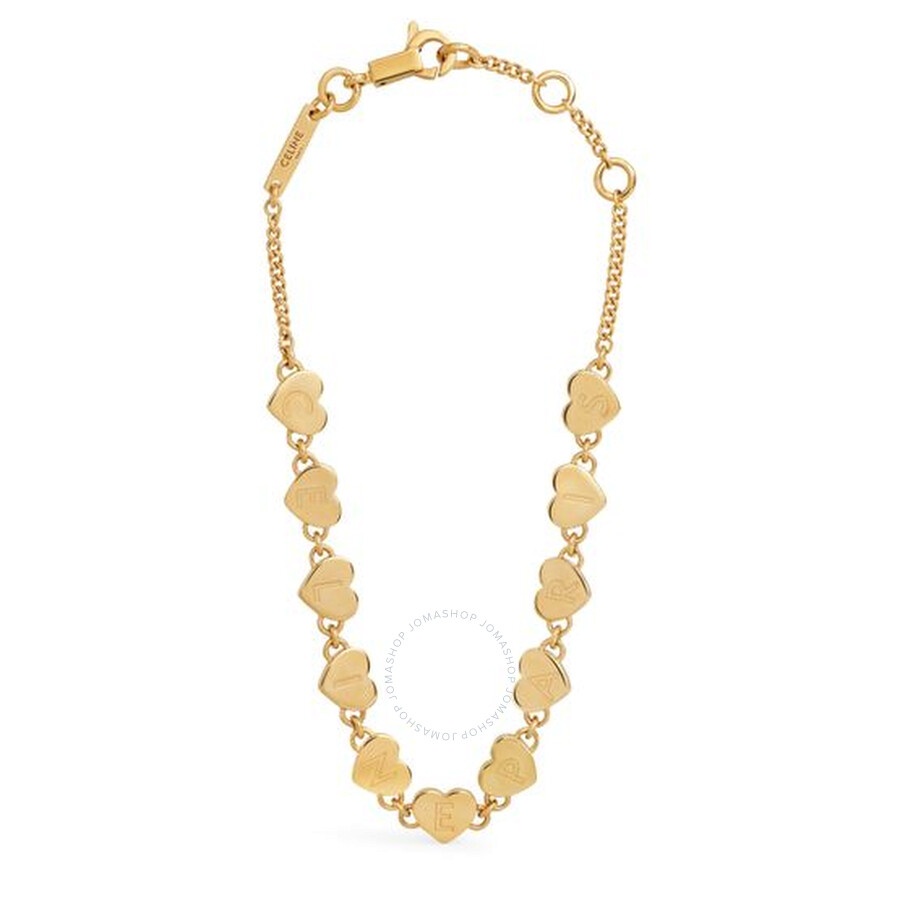 Celine Ladies Bracelets. SKU: 460SY6BRA.35OR. Barcode: 3616900427334. Color: Gold. Metal Type: Brass. Celine Gold Heart Logo Charm Bracelet. This brass bracelet with a gold finish features heart charms engraved with the signature logo and an adjustable fit for a personalized and stylish look. GENERAL Brand Type: Designer Color: Gold INFORMATION Brand: Celine Gender: Womens Model: 460SY6BRA.35OR DETAILS Material : Brass ADDITIONAL INFO UPC Code: 3616900427334 Jomashop Sku: Z-YNRDU Department: Jewelry Category: Bracelets