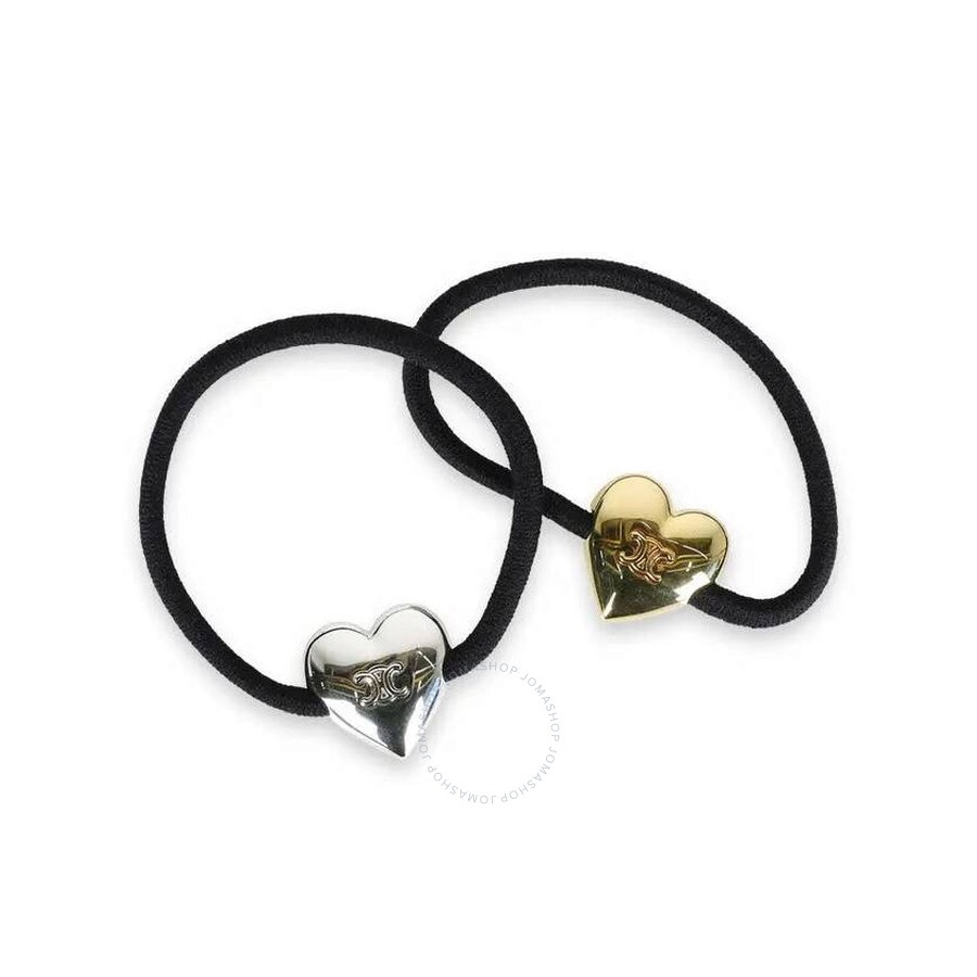 Celine Ladies Hair Accessories. SKU: 460YY6NRB.39BG. Color: Black/Gold/Silver. Celine Triomphe Heart Logo Elastic Hair Band Set Gold Silver. A chic and functional accessory, the Celine Triomphe Heart Logo Hair Tie features a nylon and rubber elastic with a brass Triomphe heart logo charm. Perfect for adding a subtle touch of luxury to any hairstyle. Composition: Nylon, Rubber, Brass. Made in Italy. GENERAL Brand Type: Designer Color: Black/Gold/Silver INFORMATION Brand: Celine Gender: Womens Model: 460YY6NRB.39BG DETAILS Category: Hair Accessories ADDITIONAL INFO UPC Code: 3616900488526 Jomashop Sku: Z-NN9KG Department: Fashion Accessories