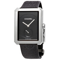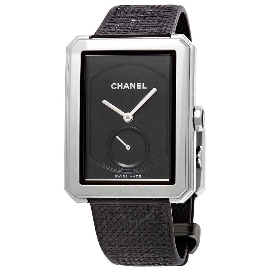 Stainless steel case with a black-plated (tweed motif) stainless steel bracelet. Fixed stainless steel bezel. Black guilloche dial with silver-tone hands. No markers. Dial Type: Analog. One subdial displaying: small seconds. Hand wind movement with a 42-hour power reserve. Scratch resistant sapphire crystal. Pull / push set with a onyx cabochon. crown. Solid case back. Rectangle case shape. Case dimensions: 37 mm x 28.6 mm. Case thickness: 7.7 mm. Fold over clasp. Water resistant at 30 meters / 100 feet. Functions: hour, minute, second. Boy-friend Series. Luxury watch style. Watch label: Swiss Made. Chanel Boy-Friend Black Guilloche Dial Ladies Hand Wound Watch H5201. INFORMATION Brand: Chanel Series: Boy-Friend Collection Name: Boy-Friend Gender: Womens Model: H5201 Watch Label: Swiss Made Movement: Hand Wind Power Reserve: 42 hours CASE Case Size: 37 mm x 28.6 mm Case Thickness: 7.7 mm Case Material: Stainless Steel Case Shape: Rectangle Case Back: Solid BAND Band Material: (Tweed Motif) Stainless Steel Band Type: Bracelet Band Color: Black-plated Clasp: Fold Over DIAL Dial Color: Black Guilloche Type: Analog Crystal: Scratch Resistant Sapphire Hands: Silver-tone Second Markers: No Markers Sub Dials: Small Seconds Bezel: Fixed Bezel Color: Silver-tone Bezel Material: Stainless Steel Crown: Pull / Push set with a Onyx Cabochon. FEATURES Water Resistance: 30 meters / 100 feet Functions: Hour, Minute, Second Watch Features: Stainless Steel, Analog ADDITIONAL INFO Watch Style: Luxury Warranty: 2 Year Jomashop Warranty UPC Code: 3599594116220 Jomashop Sku: CNH5201 Department: Watches Category: Watches