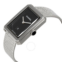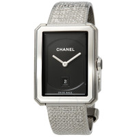 Stainless steel case with a stainless steel (tweed motif) bracelet. Fixed stainless steel bezel. Black guilloche dial with luminous silver-tone hands. No markers. Dial Type: Analog. Luminescent hands. Date display above the 6 o'clock position. Quartz movement. Scratch resistant flame fusion crystal. Pull / push crown. Solid case back. Rectangle case shape. Case dimensions: 34.6 mm x 26.7 mm. Case thickness: 7.33 mm. Tang clasp. Water resistant at 30 meters / 100 feet. Functions: date, hour, minute. Luxury watch style. Watch label: Swiss Made. Chanel Boyfriend Black Guilloche Dial Ladies Watch H4878 INFORMATION Brand: Chanel Series: Boyfriend Collection Name: Boyfriend Gender: Womens Model: H4878 Watch Label: Swiss Made Movement: Quartz CASE Case Size: 34.6 mm x 26.7 mm Case Thickness: 7.33 mm Case Material: Stainless Steel Case Shape: Rectangle Case Back: Solid BAND Band Material: Stainless Steel (Tweed Motif) Band Type: Bracelet Band Color: Silver-tone Clasp: Tang DIAL Dial Color: Black Guilloché Type: Analog Crystal: Flame Fusion Hands: Luminous Silver-tone Second Markers: No Markers Luminiscence: Hands Bezel: Fixed Bezel Color: Silver-tone Bezel Material: Stainless Steel Crown: Pull / Push FEATURES Water Resistance: 30 meters / 100 feet Calendar: Date display above the 6 o'clock position Functions: Date, Hour, Minute Watch Features: Stainless Steel, Analog ADDITIONAL INFO Watch Style: Luxury Warranty: 2 Year Jomashop Warranty UPC Code: 3599594104562 Jomashop Sku: CNH4878 Department: Watches Category: Watches