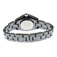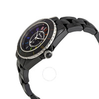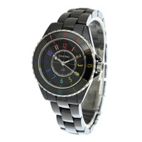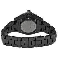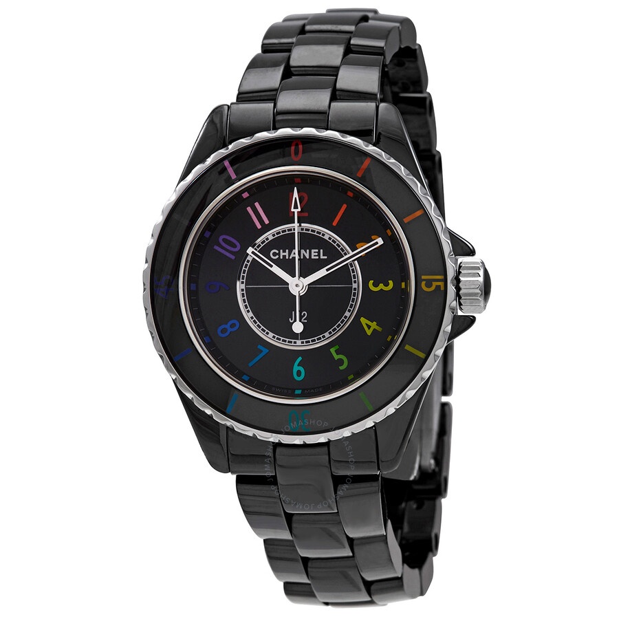 Black ceramic case with a black ceramic bracelet. Uni-directional rotating stainless steel bezel with an inlaid black ceramic ring. Black lacquered dial with black hands and (neon) Arabic numeral hour markers. Minute scale around an inner ring. Dial Type: Analog. Luminescent hands. Quartz movement. Scratch resistant sapphire crystal. Screw down crown. Solid case back. Round case shape. Case size: 33 mm. Case thickness: 12.94 mm. Hidden fold over clasp. Water resistant at 200 meters / 660 feet. Functions: hour, minute, second. Additional Info: original box, manual (complete accessories). J12 Electro Series. Luxury watch style. Watch label: Swiss Made. Chanel J12 Electro Quartz Black Dial Ladies Watch H7121. INFORMATION Brand: Chanel Series: J12 Electro Collection Name: J12 Electro Gender: Womens Model: H7121 Watch Label: Swiss Made Movement: Quartz CASE Case Size: 33 mm Case Thickness: 12.94 mm Case Material: Ceramic Case Shape: Round Case Back: Solid BAND Band Material: Ceramic Band Type: Bracelet Band Color: Black Clasp: Hidden Fold Over DIAL Dial Color: Black Lacquered Type: Analog Crystal: Scratch Resistant Sapphire Hands: Black Dial Markers: (Neon) Arabic Numeral Second Markers: Minute Scale around an inner ring Luminiscence: Hands Bezel: Uni-directional Rotating Bezel Color: Silver-tone Bezel Material: Stainless Steel with an inlaid Black Ceramic Ring Crown: Screw Down FEATURES Water Resistance: 200 meters / 660 feet Functions: Hour, Minute, Second Watch Features: Stainless Steel, Ceramic, Analog ADDITIONAL INFO Watch Style: Luxury Warranty: 2 Year Jomashop Warranty Additional Info: Original Box, Manual (Complete Accessories) Jomashop Sku: CNHH7121 Department: Watches Category: Watches