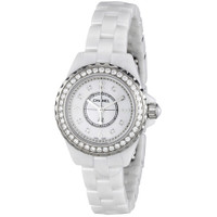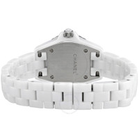 White ceramic case with a white ceramic bracelet. Unidirectional silver-tone bezel set with 40 diamonds. Mother of pearl dial with luminous hands and diamond hour markers. Arabic numerals mark the 6 and 12 o'clock positions. Minute markers around the outer rim. Dial Type: Analog. Quartz movement. Scratch resistant sapphire crystal. Solid case back. Case diameter: 29 mm. Case thickness: 11 mm. Hidden folding clasp. Water resistant at 200 meters / 660 feet. Functions: hours, minutes, seconds. Dress watch style. Watch label: Swiss Made. Chanel J12 Mother of Pearl White Ceramic Ladies Watch H2572. GENERAL Color: Mother of pearl / White INFORMATION Brand: Chanel Series: J12 Collection Name: J12 Gender: Womens Model: H2572 Watch Label: Swiss Made Movement: Quartz CASE Case Size: 29 mm Case Thickness: 11 mm Case Material: Ceramic Case Shape: Round Case Back: Solid BAND Band Material: Ceramic Band Type: Bracelet Band Color: White Clasp: Hidden Fold Over DIAL Dial Color: Mother of Pearl Type: Analog Crystal: Scratch Resistant Sapphire Hands: Luminous Dial Markers: Diamond Second Markers: Arabic Numerals mark the 6 and 12 o'clock positions. Minute markers around the outer rim Bezel: Uni-directional Silver-tone set with 40 Diamonds FEATURES Water Resistance: 200 meters / 660 feet Functions: Hours, Minutes, Seconds Watch Features: Diamond, Ceramic, Analog ADDITIONAL INFO Watch Style: Luxury Warranty: 2 Year Jomashop Warranty UPC Code: 3599594017800 Jomashop Sku: CNH2572 Department: Watches Category: Watches