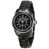 Black ceramic case with a black ceramic bracelet. Uni-directional stainless steel bezel with an inlaid black ceramic ring. Black dial with luminous hands and diamond hour markers. Arabic numerals mark the 3, 6, 9, and 12 o'clock position. Quartz movement. Scratch resistant sapphire crystal. Screw down crown. Solid case back. Case diameter: 29 mm. Case thickness: 11 mm. Hidden fold over clasp. Water resistant at 200 meters/ 660 feet. Functions: hours, minutes, seconds. Chanel J12 Quartz Black Ladies Watch H2569. GENERAL Color: Black INFORMATION Brand: Chanel Series: J12 Black Collection Name: J12 Black Gender: Womens Model: H2569 Watch Label: Swiss Made Movement: Quartz CASE Case Size: 29 mm Case Thickness: 11 mm Case Material: Ceramic Case Shape: Round Case Back: Solid BAND Band Material: Ceramic Band Type: Bracelet Band Color: Black Clasp: Hidden Fold Over DIAL Dial Color: Black Type: Analog Crystal: Scratch Resistant Sapphire Hands: Luminous Dial Markers: Diamond Second Markers: Arabic Numerals Mark the 3, 6, 9, and 12 O'clock Position Bezel: Uni-directional Bezel Color: Silver-tone Bezel Material: Stainless Steel with an inlaid Black Ceramic Ring Crown: Screw Down FEATURES Water Resistance: 200 meters / 660 feet Functions: Hours, Minutes, Seconds Watch Features: Diamond, Stainless Steel, Ceramic, Analog ADDITIONAL INFO Watch Style: Fashion Warranty: 2 Year Jomashop Warranty UPC Code: 3599594017770 Jomashop Sku: CNH2569 Department: Watches Category: Watches