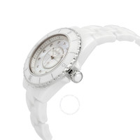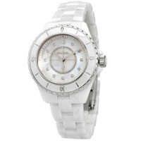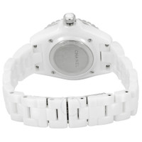 White ceramic case and bracelet. Fixed white stainless steel bezel with an inlaid white ceramic ring. White mother of pearl dial with luminous silver-tone hands and diamond hour markers. Arabic numerals appear at the 3, 6, 9 and 12 o'clock positions. Minute markers around the outer rim. Dial Type: Analog. Luminescent hands. Quartz movement. Scratch resistant sapphire crystal. Screw down crown. Solid case back. Round case shape. Case size: 33 mm. Case thickness: 12.94 mm. Hidden fold over clasp. Water resistant at 200 meters / 660 feet. Functions: hour, minute, second. Additional Info: original box, manual (complete accessories). J12 Series. Luxury watch style. Watch label: Swiss Made. Chanel J12 Quartz Diamond White Dial Ladies Watch H5704. INFORMATION Brand: Chanel Series: J12 Collection Name: J12 Gender: Womens Model: H5704 Watch Label: Swiss Made Movement: Quartz CASE Case Size: 33 mm Case Thickness: 12.94 mm Case Material: Ceramic Case Shape: Round Case Back: Solid BAND Band Material: Ceramic Band Type: Bracelet Band Color: White Clasp: Hidden Fold Over DIAL Dial Color: White Mother of Pearl Type: Analog Crystal: Scratch Resistant Sapphire Hands: Luminous Silver-tone Dial Markers: Diamond Second Markers: Arabic Numerals appear at the 3, 6, 9 and 12 o'clock positions. Minute Markers around the outer rim Luminiscence: Hands Bezel: Fixed Bezel Color: White Bezel Material: Stainless Steel with a White Ceramic Ring Crown: Screw Down FEATURES Water Resistance: 200 meters / 660 feet Functions: Hour, Minute, Second Watch Features: Diamond, Stainless Steel, Ceramic, Analog ADDITIONAL INFO Watch Style: Luxury Warranty: 2 Year Jomashop Warranty Additional Info: Original Box, Manual (Complete Accessories) Jomashop Sku: CNH5704 Department: Watches Category: Watches