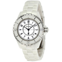 White ceramic case with a white ceramic bracelet. Unidirectional rotating silver-tone bezel with a white ceramic top ring. White dial with luminous black hands and Arabic numeral hour markers. Minute markers around the outer rim. Dial Type: Analog. Luminescent hands and hour markers. Date display between the 4 and 5 o'clock positions. Quartz movement. Scratch resistant sapphire crystal. Screw down crown set with white cabochon. Solid case back. Case size: 33 mm. Case thickness: 11 mm. Round case shape. Band width: 14 mm. Band length: 7 inches. Hidden deployment clasp. Water resistant at 200 meters / 660 feet. Functions: hours, minutes, seconds, date. Sport watch style. Watch label: Swiss Made. Chanel J12 Quartz White Dial Ladies Watch H0968. GENERAL Color: White INFORMATION Brand: Chanel Series: J12 Collection Name: J12 Gender: Womens Model: H0968 Watch Label: Swiss Made Movement: Quartz CASE Case Size: 33 mm Case Thickness: 11 mm Case Material: Ceramic Case Shape: Round Case Back: Solid BAND Band Material: Ceramic Band Type: Bracelet Band Color: White Band Length: 7 inches Band Width: 14 mm Clasp: Hidden Deployment DIAL Dial Color: White Type: Analog Crystal: Scratch Resistant Sapphire Hands: Luminous Black Dial Markers: Arabic Numeral Second Markers: Minute markers around the outer rim Luminiscence: Hands and Hour Markers Bezel: Uni-directional Rotating Bezel Color: Silver-tone Bezel Material: White Ceramic Top Ring Crown: Screw Down set with White Cabochon FEATURES Water Resistance: 200 meters / 660 feet Calendar: Date display between the 4 and 5 o'clock positions Functions: Hours, Minutes, Seconds, Date Watch Features: Ceramic, Analog ADDITIONAL INFO Watch Style: Sport Warranty: 2 Year Jomashop Warranty UPC Code: 3599590285418 Jomashop Sku: CNH0968 Department: Watches Category: Watches