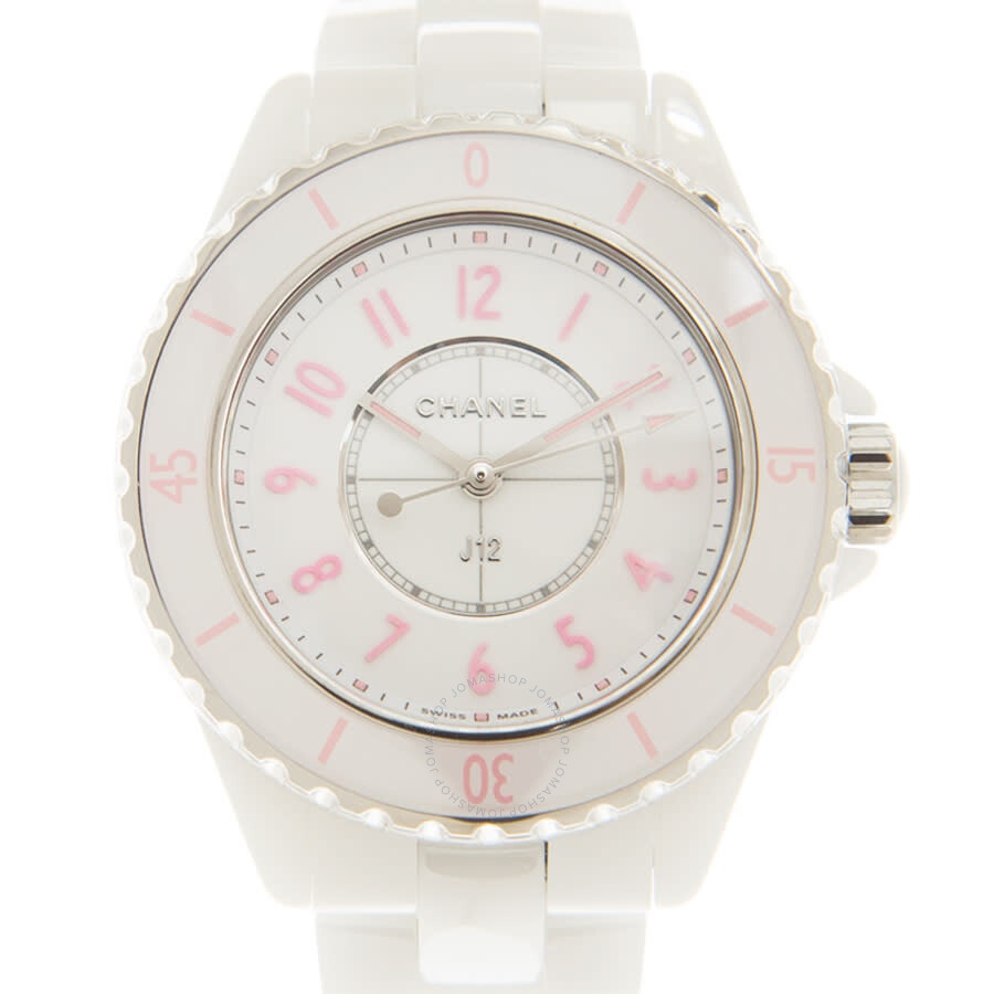White ceramic case with a white ceramic bracelet. Uni-directional rotating white ceramic inlay bezel. White dial with silver-tone hands and Arabic numeral hour markers. Minute scale around the inner rim. Dial Type: Analog. Luminescent hands and markers. Quartz movement. Scratch resistant sapphire crystal. Screw down crown. Solid case back. Round case shape. Case size: 33 mm. Fold over clasp. Water resistant at 200 meters / 660 feet. Functions: hour, minute, second. Additional Info: original box, manual (complete accessories). J12 Series. Luxury watch style. Watch label: Swiss Made. Chanel J12 Quartz White Dial Ladies Watch H6755. INFORMATION Brand: Chanel Series: J12 Collection Name: J12 Gender: Womens Model: H6755 Watch Label: Swiss Made Movement: Quartz CASE Case Size: 33 mm Case Thickness: 12.94 mm Case Material: Ceramic and Stainless Steel Case Shape: Round Case Back: Solid BAND Band Material: Ceramic Band Type: Bracelet Band Color: White Clasp: Fold Over DIAL Dial Color: White Type: Analog Crystal: Scratch Resistant Sapphire Hands: Silver-tone Dial Markers: Arabic Numeral Second Markers: Minute Scale around the inner rim Luminiscence: Hands and Markers Bezel: Uni-directional Rotating Bezel Color: White Bezel Material: Ceramic Crown: Screw Down FEATURES Water Resistance: 200 meters / 660 feet Functions: Hour, Minute, Second Watch Features: Ceramic, Analog ADDITIONAL INFO Watch Style: Luxury Warranty: 2 Year Jomashop Warranty Additional Info: Original Box, Manual (Complete Accessories) Jomashop Sku: CNHH6755 Department: Watches Category: Watches