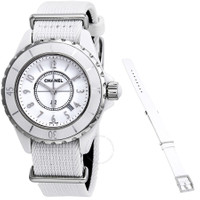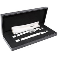 White ceramic case with a white (calfskin) leather strap. Uni-directional rotating stainless steel bezel with a white ceramic top ring. White dial with luminous silver-tone hands and Arabic numeral hour markers. Minute markers around the outer rim. Dial Type: Analog. Luminescent hands and markers. Date display between the 4 and 5 o'clock positions. Quartz movement. Scratch resistant sapphire crystal. Screw down crown. Solid case back. Round case shape. Case size: 33 mm. Case thickness: 10 mm. Tang clasp. Water resistant at 200 meters / 660 feet. Functions: date, hour, minute, second. Casual watch style. Watch label: Swiss Made. Chanel J12 White Dial Ladies Watch H4656. CASE Case Size: 33 mm Case Thickness: 10 mm Case Material: Ceramic Case Shape: Round Case Back: Solid BAND Band Material: Calfskin Leather Band Type: Strap Band Color: White Clasp: Tang DIAL Dial Color: White Type: Analog Crystal: Scratch Resistant Sapphire Hands: Luminous Silver-tone Dial Markers: Arabic Numeral Second Markers: Minute Markers around the outer rim Luminiscence: Hands and Markers Bezel: Uni-directional Rotating Bezel Material: Stainless Steel with a White Ceramic Top Ring Crown: Screw Down INFORMATION Brand: Chanel Series: J12 Collection Name: J12 Gender: Womens Model: H4656 Watch Label: Swiss Made Movement: Quartz FEATURES Water Resistance: 200 meters / 660 feet Calendar: Date display between 4 and 5 o'clock position Functions: Date, Hour, Minute, Second Watch Features: Ceramic, Leather, Stainless Steel ADDITIONAL INFO Watch Style: Casual Warranty: 2 Year Jomashop Warranty UPC Code: 3599594065603 Jomashop Sku: CNH4656 Department: Watches Category: Watches