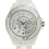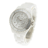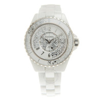 White ceramic case and bracelet. Uni-directional rotating ceramic bezel. White dial with diamond-Arabic hour markers. Dial Type: Analog. Quartz movement. Scratch resistant sapphire crystal. Screw down crown. Solid case back. Round case shape, case size: 33 mm. Deployment clasp. Water resistant at 200 meters / 660 feet. Functions: hour, minute, second. J12·20 Series. Luxury watch style. Watch label: Swiss Made. Chanel J12·20 Quartz Diamond White Dial Ladies Watch H6477. INFORMATION Brand: Chanel Series: J12·20 Collection Name: J12·20 Gender: Womens Model: H6477 Watch Label: Swiss Made Movement: Quartz CASE Case Size: 33 mm Case Material: Ceramic Case Shape: Round Case Back: Solid BAND Band Material: Ceramic Band Type: Bracelet Band Color: White Clasp: Deployment DIAL Dial Color: White Type: Analog Crystal: Scratch Resistant Sapphire Dial Markers: Diamond-Arabic Bezel: Uni-directional Rotating Bezel Material: Ceramic Crown: Screw Down FEATURES Water Resistance: 200 meters / 660 feet Functions: Hour, Minute, Second Watch Features: Diamond, Ceramic, Analog ADDITIONAL INFO Watch Style: Luxury Warranty: 2 Year Jomashop Warranty Jomashop Sku: CNHH6477 Department: Watches Category: Watches