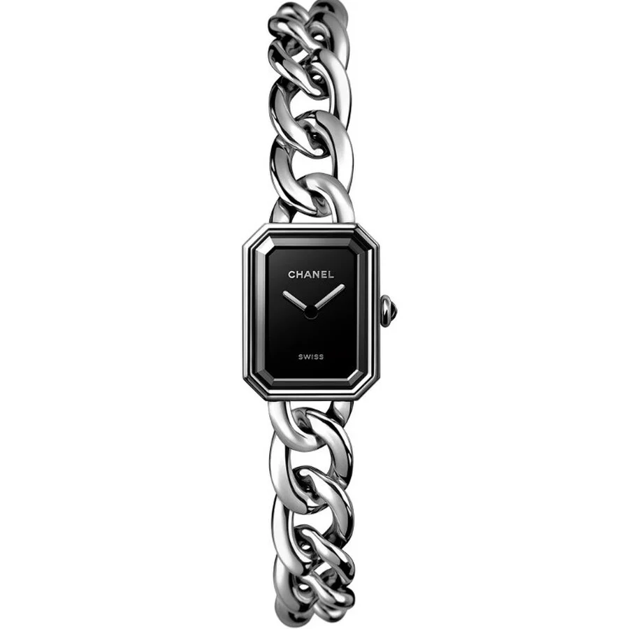 Silver-tone stainless steel case and bracelet. Fixed silver-tone stainless steel bezel. Black dial with black hands. Dial Type: Analog. Quartz movement. Pull / push crown. Rectangle case shape, case size: 19.7 mm. Functions: hour, minute. Premiere Gourmette Series. Casual watch style. Watch label: Swiss Made. Chanel Premiere Gourmette Quartz Black Dial Ladies Watch H7019. GENERAL Box Type: Original Box Brand Type: Designer CASE Case Material: Stainless Steel Case Shape: Rectangle BAND Band Material: Stainless Steel Band Type: Bracelet Band Color: Silver-tone DIAL Dial Color: Black Type: Analog Hands: Black Bezel: Fixed Bezel Color: Silver-tone Bezel Material: Stainless Steel Crown: Pull / Push INFORMATION Brand: Chanel Series: Premiere Gourmette Collection Name: Premiere Gourmette Gender: Womens Model: H7019 Watch Label: Swiss Made Movement: Quartz FEATURES Functions: Hour, Minute Watch Features: Analog, Stainless Steel ADDITIONAL INFO Watch Style: Casual Warranty: 2 Year Jomashop Warranty Jomashop Sku: CNH7019 Department: Watches