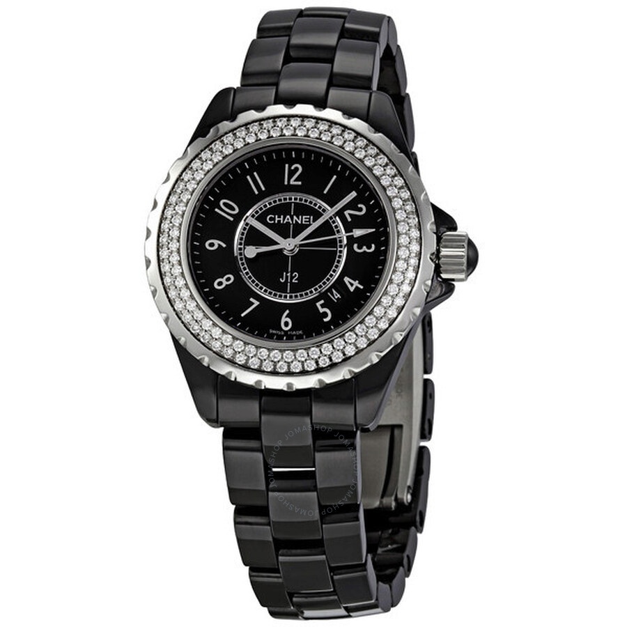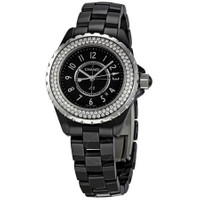 Pre-owned Black ceramic case with a black ceramic bracelet. Fixed silver-tone bezel set with diamonds. Black dial with luminous hands and Arabic numeral hour markers. Minute markers around the outer rim. Dial Type: Analog. Luminescent hands and dial markers. Automatic date between 4 and 5 o'clock positions. Quartz movement. Scratch resistant sapphire crystal. Case diameter: 33 mm. Round case shape. Band length: 7 inches. Deployment clasp with push button. Water resistant at 200 meters / 660 feet. Functions: hours, minutes, seconds, date. Fashion watch style. Watch label: Swiss Made. Chanel J12 Ladies Watch H0949. GENERAL Collection Name: J12 Diamonds INFORMATION Brand: Chanel Series: J12 Diamonds Model: H0949 Gender: Womens Watch Label: Swiss Made Movement: Quartz CONDITION INFORMATION Box: No Preowned Item Condition: Excellent Papers: No CASE Case Size: 33 mm Case Material: Ceramic Case Shape: Round DIAL Type: Analog Dial Color: Black Crystal: Scratch Resistant Sapphire Hands: Luminous Second Markers: Minute markers around the outer rim Dial Markers: Arabic Numeral Luminiscence: Hands and Dial Markers Bezel: Fixed Silver-tone set with Diamond Bezel Material: Diamond Crown: Screw Down BAND Band Type: Bracelet Band Material: Ceramic Band Color: Black Clasp: Deployment with Push Button Release FEATURES Water Resistance: 200 meters / 660 feet Calendar: Date display between 4 and 5 o'clock position Functions: Date, Hour, Minute, Second Watch Features: Diamond, Ceramic, Analog ADDITIONAL INFO Watch Style: Fashion Warranty: 1 Year Jomashop Warranty UPC Code: 639767605700 Jomashop Sku: PRE-P-CNH62970 Department: Watches Category: Watches
