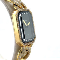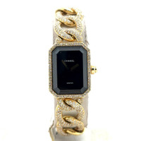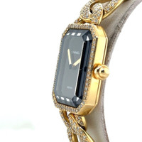 Yellow gold-tone 18kt yellow gold case with a yellow gold-tone diamond set 18kt yellow gold bracelet. Fixed yellow gold-tone bezel with diamond set 18kt yellow gold. Black dial with yellow gold-tone hands. Dial Type: Analog. Quartz movement. Scratch resistant sapphire crystal. Pull / push crown. Solid case back. Rectangle case shape, case size: 20 mm, case thickness: 7 mm. Band width: 14 mm. Jewelry clasp. Water resistant at 30 meters / 100 feet. Functions: hour, minute. Premiere Series. Luxury watch style. Watch label: Swiss Made. Pre-owned Chanel Premiere Quartz Diamond Black Dial Ladies Watch H0114. GENERAL Collection Name: Premiere INFORMATION Brand: Chanel Series: Premiere Model: H0114 Gender: Womens Watch Label: Swiss Made Movement: Quartz CONDITION INFORMATION Box: No Preowned Item Condition: Excellent Papers: No CASE Case Size: 20 Case Thickness: 7 mm Case Material: 18kt Yellow Gold Case Shape: Rectangle Case Back: Solid DIAL Type: Analog Dial Color: Black Crystal: Scratch Resistant Sapphire Hands: Yellow Gold-tone Bezel: Fixed Bezel Color: Yellow Gold-tone Bezel Material: Diamond Set 18kt Yellow Gold Crown: Pull / Push BAND Band Type: Bracelet Band Material: Diamond Set 18kt Yellow Gold Band Color: Yellow Gold-tone Band Width: 14 mm Clasp: Jewelry FEATURES Water Resistance: 30 meters / 100 feet Functions: Hour, Minute Watch Features: Diamond, Gold, Analog ADDITIONAL INFO Watch Style: Luxury Warranty: 1 Year Jomashop Warranty Jomashop Sku: PRE-P-CNH86562 Department: Watches