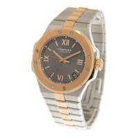 Silver-tone stainless steel case with a two-tone (silver-tone and rose gold-tone) 18kt rose gold and stainless steel bracelet. Fixed rose gold-tone 18kt rose gold bezel. Grey dial with rose gold-tone hands and Roman numeral hour markers. Minute markers around the outer rim. Dial Type: Analog. Luminescent hands and markers. Date display between 4 and 5 o'clock position. Chopard Calibre 01.01-C Automatic movement, containing 40 Jewels, composed of 207 parts, bitting at 28800 vph, and has a power reserve of approximately 60 hours. Scratch resistant sapphire crystal. Screw down crown. Transparent see through case back. Round case shape, case size: 41 mm. Hidden clasp. Water resistant at 100 meters / 330 feet. Functions: date, hour, minute, second, chronometer. Additional Info: original box, international warranty card, manual (complete accessories). Alpine Eagle Series. Luxury watch style. Watch label: Swiss Made. Chopard Alpine Eagle Automatic Chronometer Grey Dial Men's Watch 298600 6001. CASE Case Size: 41 Case Material: Stainless Steel Case Shape: Round Case Back: Transparent See Through BAND Band Material: 18kt Rose Gold and Stainless Steel Band Type: Bracelet Band Color: Two-tone (Silver-tone and Rose Gold-tone) Clasp: Hidden DIAL Dial Color: Grey Type: Analog Crystal: Scratch Resistant Sapphire Hands: Rose Gold-tone Dial Markers: Roman Numeral Second Markers: Minute Markers around the outer rim Luminiscence: Hands and Markers Bezel: Fixed Bezel Color: Rose Gold-tone Bezel Material: 18kt Rose Gold Crown: Screw Down INFORMATION Brand: Chopard Series: Alpine Eagle Collection Name: Alpine Eagle Gender: Mens Model: 298600 6001 Watch Label: Swiss Made Movement: Automatic Engine: Chopard Calibre 01.01-C Power Reserve: 60 hours FEATURES Water Resistance: 100 meters / 330 feet Calendar: Date display between 4 and 5 o'clock position Functions: Date, Hour, Minute, Second, Chronometer Watch Features: Stainless Steel, Gold, Chronometer, Analog ADDITIONAL INFO Watch Style: Luxury Warranty: 2 Year Jomashop Warranty Additional Info: Original Box, Manual (Complete Accessories) Jomashop Sku: CP2986006001 Department: Watches Category: Watches