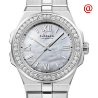 Silver-tone stainless steel case with a polished stainless steel bracelet. Fixed silver-tone bezel with diamond set. Mother of pearl dial with silver-tone hands and Roman numeral, index hour markers. Dial Type: Analog. Luminescent hands and markers. Chopard Calibre 09.01-C Automatic movement, containing 27 Jewels, bitting at 25200 vph, and has a power reserve of approximately 42 hours. Scratch resistant sapphire crystal. Screw down crown. Transparent case back. Round case shape, case size: 36 mm, case thickness: 8.40 mm. Hidden folding clasp. Water resistant at 100 meters. Functions: hour, minute, second. Alpine Eagle Series. Dress watch style. Watch label: Swiss Made. Chopard Alpine Eagle Automatic Diamond Ladies Watch 298601-3002. INFORMATION Brand: Chopard Series: Alpine Eagle Collection Name: Alpine Eagle Gender: Womens Model: 298601-3002 Watch Label: Swiss Made Movement: Automatic Engine: Chopard Calibre 09.01-C Power Reserve: 42 hours CASE Case Size: 36 mm Case Thickness: 8.40 mm Case Material: Stainless Steel Case Shape: Round Case Back: Transparent BAND Band Material: Stainless Steel Band Type: Bracelet Band Color: Polished Clasp: Hidden Folding Clasp DIAL Dial Color: Mother of Pearl Type: Analog Crystal: Scratch Resistant Sapphire Hands: Silver-tone Dial Markers: Roman Numeral, Index Luminiscence: Hands and Markers Bezel: Fixed Bezel Color: Silver-tone Bezel Material: Diamond Set Crown: Screw Down FEATURES Water Resistance: 100 meters Functions: Hour, Minute, Second Watch Features: Diamond, Stainless Steel, Analog ADDITIONAL INFO Watch Style: Dress Warranty: 2 Year Jomashop Warranty Jomashop Sku: CP298601-3002 Department: Watches Category: Watches