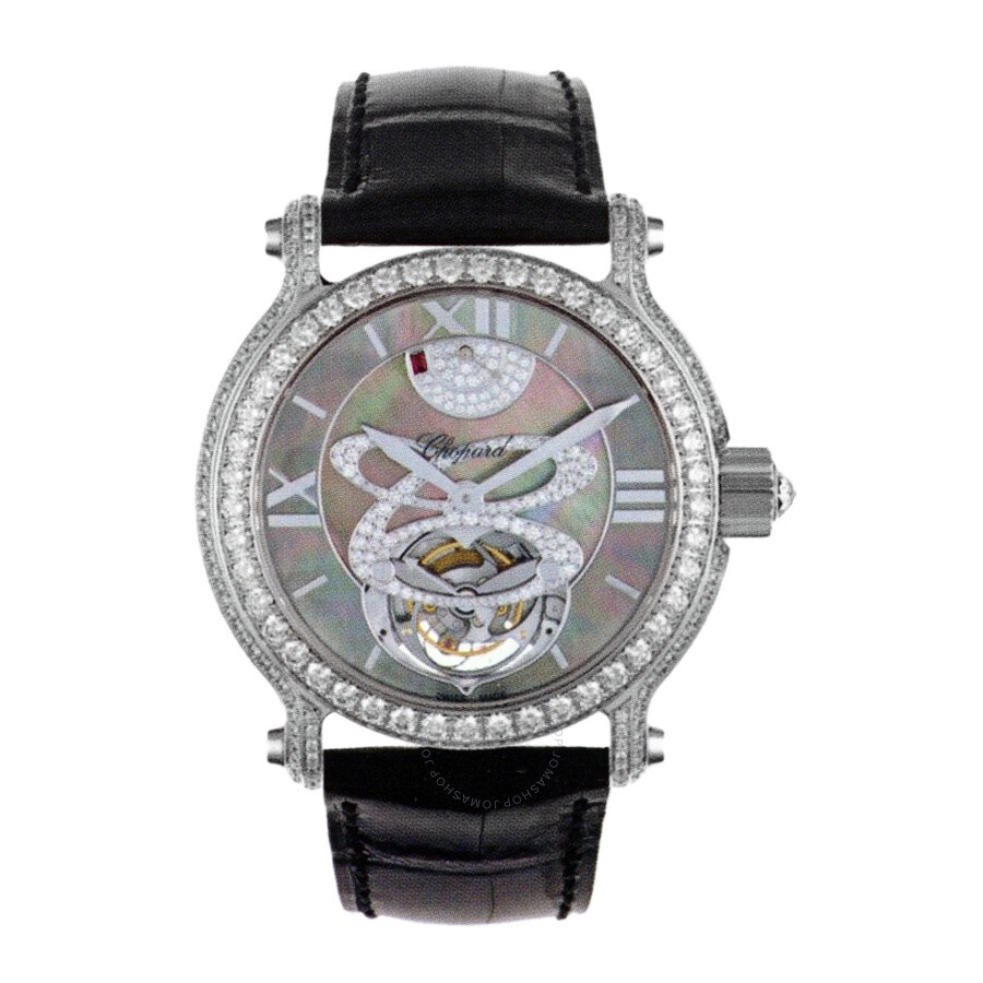 18kt white gold case with a black leather strap. Fixed silver-tone diamond set bezel. Black mother of pearl dial with silver-toned hands and index hour markers. Roman numerals mark the 3, 9 and 12 o'clock positions. Dial Type: Analog. Hand wind movement. Scratch resistant sapphire crystal. Exhibition see through case back. Round case shape. Case size: 31 mm. Tang clasp. Water resistant at 30 meters / 100 feet. Functions: hour, minute, tourbillon. Luxury watch style. Watch label: Swiss Made. Item Variations: 134188 1007, 134188.1007, 1341881007. Chopard Classic Black Mother of Pearl Dial 18kt White Gold Diamond Black Leather Tourbillon Ladies Watch 134188-1007. GENERAL Color: Black / Gold / Mother of pearl / White INFORMATION Brand: Chopard Series: Classic Collection Name: Classic Gender: Womens Model: 134188-1007 Watch Label: Swiss Made Movement: Hand Wind CASE Case Size: 31 mm Case Material: 18kt White Gold Case Shape: Round Case Back: Exhibition See Through BAND Band Material: Leather Band Type: Strap Band Color: Black Clasp: Tang DIAL Dial Color: Black Mother of Pearl Type: Analog Crystal: Scratch Resistant Sapphire Hands: Silver-toned Dial Markers: Index Second Markers: Roman Numerals mark the 3, 9 and 12 o'clock positions Bezel: Fixed Bezel Color: Silver-tone Bezel Material: Diamond Set FEATURES Water Resistance: 30 meters / 100 feet Functions: Hour, Minute, Tourbillon Watch Features: Tourbillon, Diamond, Leather, Gold, Analog ADDITIONAL INFO Watch Style: Luxury Warranty: 2 Year Jomashop Warranty Jomashop Sku: CP134188-1007 Item Variation: 134188 1007, 134188.1007, 1341881007 Department: Watches Category: Watches