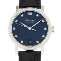 18kt white gold case with a black leather strap. Fixed bezel with diamond set 18kt white gold. Black dial with silver-tone hands and diamond hour markers. Dial Type: Analog. Date display at the 6 o'clock position. Automatic movement. Scratch resistant sapphire crystal. Screw down crown. Transparent see through case back. Round case shape, case size: 33 mm. Buckle clasp. Functions: date, hour, minute, second. Additional Info: original box, international warranty card, manual (complete accessories). Classique Series. Luxury watch style. Watch label: Swiss Made. Chopard Classique Automatic Diamond Black Dial Ladies Watch 134200 1004. INFORMATION Brand: Chopard Series: Classique Collection Name: Classique Gender: Womens Model: 134200 1004 Watch Label: Swiss Made Movement: Automatic CASE Case Size: 33 mm Case Material: 18kt White Gold Case Shape: Round Case Back: Transparent See Through BAND Band Material: Leather Band Type: Strap Band Color: Black Clasp: Buckle DIAL Dial Color: Black Type: Analog Crystal: Scratch Resistant Sapphire Hands: Silver-tone Dial Markers: Diamond Bezel: Fixed Bezel Material: Diamond Set 18kt White Gold Crown: Screw Down FEATURES Calendar: Date display at the 6 o'clock position Functions: Date, Hour, Minute, Second Watch Features: Diamond, Leather, Gold, Analog ADDITIONAL INFO Watch Style: Luxury Warranty: 2 Year Jomashop Warranty Additional Info: Original Box, Manual (Complete Accessories) Jomashop Sku: CP1342001004 Department: Watches Category: Watches