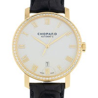 Yellow gold-tone 18kt yellow gold case with a black leather strap. Fixed yellow gold-tone bezel with diamond set 18kt yellow gold. White dial with yellow gold-tone hands and Roman numeral hour markers. Dial Type: Analog. Date display at the 6 o'clock position. Automatic movement. Scratch resistant sapphire crystal. Solid case back. Round case shape, case size: 40 mm. Buckle clasp. Functions: date, hour, minute, second. Additional Info: original box, manual (complete accessories). Classique Series. Luxury watch style. Watch label: Swiss Made. Chopard Classique Automatic Diamond White Dial Men's Watch 171278-0001. CASE Case Size: 40 Case Material: 18kt Yellow Gold Case Shape: Round Case Back: Solid BAND Band Material: Leather Band Type: Strap Band Color: Black Clasp: Buckle DIAL Dial Color: White Type: Analog Crystal: Scratch Resistant Sapphire Hands: Yellow Gold-tone Dial Markers: Roman Numeral Bezel: Fixed Bezel Color: Yellow Gold-tone Bezel Material: Diamond Set 18kt Yellow Gold INFORMATION Brand: Chopard Series: Classique Collection Name: Classique Gender: Mens Model: 171278-0001 Watch Label: Swiss Made Movement: Automatic FEATURES Calendar: Date display at the 6 o'clock position Functions: Date, Hour, Minute, Second Watch Features: Diamond, Leather, Gold, Analog ADDITIONAL INFO Watch Style: Luxury Warranty: 2 Year Jomashop Warranty Additional Info: Original Box, Manual (Complete Accessories) Jomashop Sku: CP171278-0001 Department: Watches Category: Watches