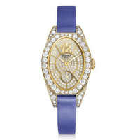 18 kt yellow gold case with a purple satin bracelet. Fixed 18 kt yellow gold bezel set with diamonds bezel. Diamond dial with gold-tone hands and stick hour markers. Arabic numeral marks the 12 o'clock position. Dial Type: Analog. Small seconds sub-dial at the 6 o'clock position. Quartz movement. Scratch resistant sapphire crystal. Solid case back. Case diameter: 24 x 40 mm. Case thickness: 6.7 mm. Oval case shape. Tang clasp. Water resistant at 30 meters / 100 feet. Functions: hour, minute, second. Luxury watch style. Watch label: Swiss Made. Chopard Classique Femme Diamond 18k Yellow Gold Ladies Watch 137228-0001. GENERAL Color: Gold / Purple / Yellow INFORMATION Brand: Chopard Series: Classique Femme Collection Name: Classique Femme Gender: Womens Model: 137228-0001 Watch Label: Swiss Made Movement: Quartz CASE Case Size: 40 mm x 24 mm Case Thickness: 6.7 mm Case Material: 18kt Yellow Gold Case Shape: Oval Case Back: Solid BAND Band Material: Satin Band Type: Strap Band Color: Purple Clasp: Tang DIAL Dial Color: Diamond Type: Analog Crystal: Scratch Resistant Sapphire Hands: Gold-tone Dial Markers: Stick Second Markers: Arabic numeral marks the 12 o'clock position Sub Dials: One - Small Second at the 6 o'clock position Bezel: Fixed 18 kt yellow gold set with diamonds FEATURES Water Resistance: 30 meters / 100 feet Functions: Hour, Minute, Second Watch Features: Diamond, Gold, Analog ADDITIONAL INFO Watch Style: Luxury Warranty: 2 Year Jomashop Warranty Jomashop Sku: CP137228-0001 Item Variation: 137228 0001, 137228.0001, 1372280001 Department: Watches Category: Watches