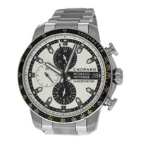 Grey titanium case and bracelet. Fixed tachymeter scale black titanium bezel. White dial with black hands and Arabic numeral hour markers. Minute markers around the outer rim. Dial Type: Analog. Luminescent hands and markers. Date display at the 3 o'clock position. Chronograph - three sub-dials displaying: 60 second, 30 minute and 12 hour. Automatic movement. Solid case back. Round case shape, case size: 44 mm. Fold over clasp with a safety release. Water resistant at 100 meters / 330 feet. Functions: chronograph, date, hour, minute, second. Grand Prix De Monaco Series. Casual watch style. Watch label: Swiss Made. Chopard Grand Prix de Monaco Chronograph Automatic White Dial Men's Watch 158570-3003. CASE Case Size: 44 Case Material: Titanium Case Shape: Round Case Back: Solid BAND Band Material: Titanium Band Type: Bracelet Band Color: Grey Clasp: Fold Over with Safety Release DIAL Dial Color: White Type: Analog Hands: Black Dial Markers: Arabic Numeral Second Markers: Minute Markers around the outer rim Sub Dials: Three - 60 Second, 30 Minute and 12 Hour Luminiscence: Hands and Markers Bezel: Fixed Tachymeter Scale Bezel Color: Black Bezel Material: Titanium INFORMATION Brand: Chopard Series: Grand Prix De Monaco Collection Name: Grand Prix de Monaco Gender: Mens Model: 158570-3003 Watch Label: Swiss Made Movement: Automatic FEATURES Water Resistance: 100 meters / 330 feet Calendar: Date display at the 3 o'clock position Functions: Chronograph, Date, Hour, Minute, Second Watch Features: Chronograph, Titanium, Analog ADDITIONAL INFO Watch Style: Casual Warranty: 2 Year Jomashop Warranty Jomashop Sku: CP158570-3003 Department: Watches Category: Watches