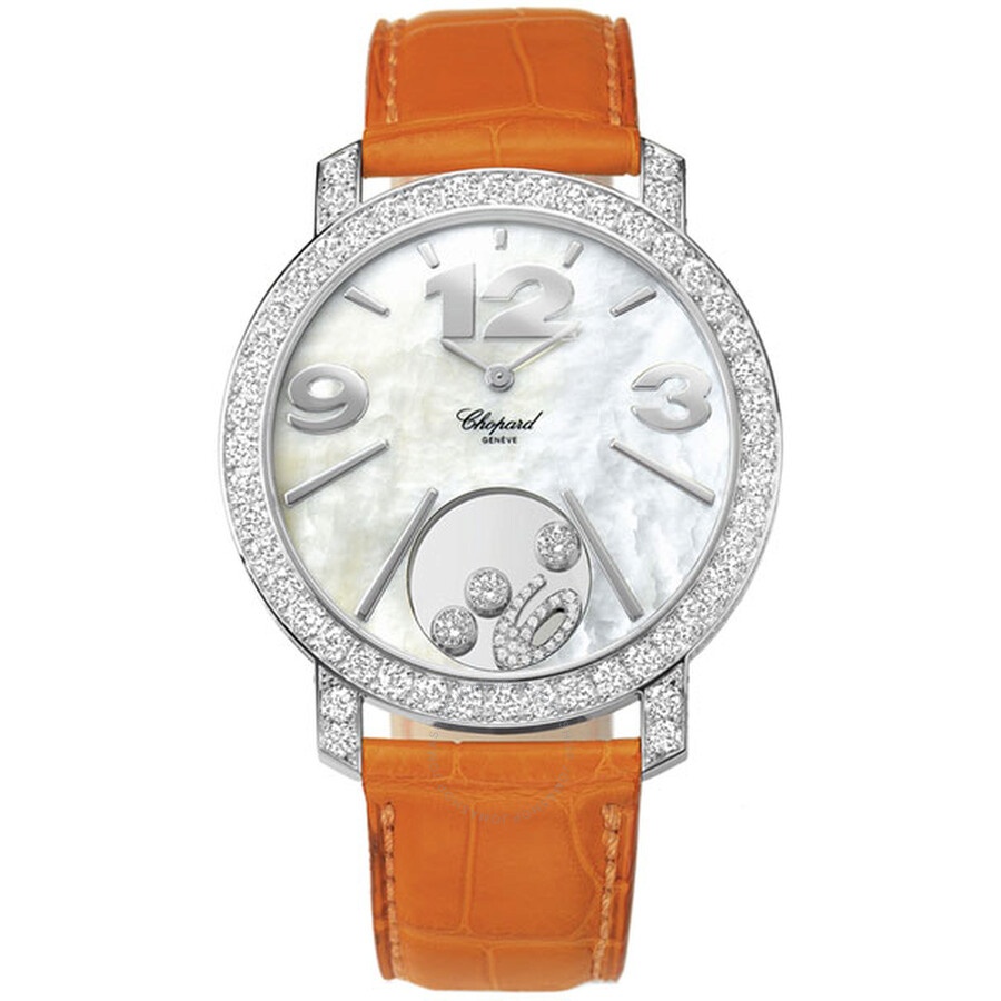18kt white gold case with a orange leather strap. Fixed bezel set with diamonds bezel. Mother of pearl dial with silver-toned hands and index hour markers. Dial Type: Analog. Quartz movement. Pull / push crown. Case diameter: 40 mm. Round case shape. Functions: hour, minute, second. Luxury watch style. Watch label: Swiss Made. Chopard Happy Diamonds Mother of Pearl Dial 18kt White Gold Diamond Leather Ladies Watch 207450-1005. GENERAL Color: Gold / Mother of pearl / Orange / White INFORMATION Brand: Chopard Series: Happy Diamonds Collection Name: Happy Diamonds Gender: Womens Model: 207450-1005 Watch Label: Swiss Made Movement: Quartz CASE Case Size: 40 mm Case Material: 18kt White Gold Case Shape: Round BAND Band Material: Leather Band Type: Strap Band Color: Orange Clasp: Tang DIAL Dial Color: Mother of Pearl Type: Analog Crystal: Scratch Resistant Sapphire Hands: Silver-toned Dial Markers: Index Bezel: Fixed Bezel Color: 18kt White Gold Bezel Material: Diamond Set Crown: Pull / Push FEATURES Functions: Hour, Minute, Second Watch Features: Diamond, Leather, Gold, Analog ADDITIONAL INFO Watch Style: Luxury Warranty: 2 Year Jomashop Warranty Jomashop Sku: CP207450-1005 Item Variation: 207450 1005, 207450.1005, 2074501005 Department: Watches Category: Watches