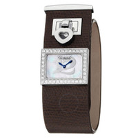 Silver-tone stainless steel case with a brown lizard leather strap. Fixed silver-tone diamond set bezel. Mother of pearl dial with blue-tone hands. Dial Type: Analog. Quartz movement. Scratch resistant sapphire crystal. Pull / push crown. Rectangle case shape, case size: 26 mm x 20 mm, case thickness: 7.2 mm. Jewelry clasp. Water resistant at 20 meters / 65 feet. Functions: hour, minute. Happy Diamonds Series. Luxury watch style. Watch label: Swiss Made. Item Variations: 208503 2001, 208503.2001, 2085032001. Chopard Happy Diamonds Mother Of Pearl Dial Brown Leather Ladies Watch 208503-2001. GENERAL Color: Brown / Mother of pearl INFORMATION Brand: Chopard Series: Happy Diamonds Collection Name: Happy Diamonds Gender: Womens Model: 208503-2001 Watch Label: Swiss Made Movement: Quartz CASE Case Size: 26 mm x 20 mm Case Thickness: 7.2 mm Case Material: Stainless Steel Case Shape: Rectangle BAND Band Material: Lizard Leather Band Type: Strap Band Color: Brown Clasp: Jewelry DIAL Dial Color: Mother Of Pearl Type: Analog Crystal: Scratch Resistant Sapphire Hands: Blue-tone Bezel: Fixed Bezel Color: Silver-tone Bezel Material: Diamond Set Crown: Pull / Push FEATURES Water Resistance: 20 meters / 65 feet Functions: Hour, Minute Watch Features: Diamond, Stainless Steel, Leather, Analog ADDITIONAL INFO Watch Style: Luxury Warranty: 2 Year Jomashop Warranty Jomashop Sku: CP208503-2001 Item Variation: 208503 2001, 208503.2001, 2085032001 Department: Watches Category: Watches