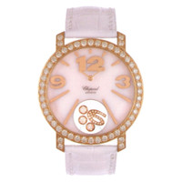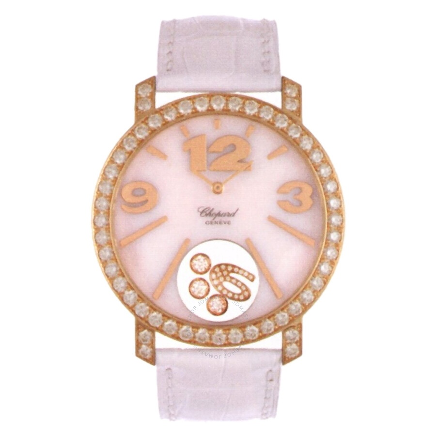 18kt rose gold case set with diamonds case with a pink leather strap. Fixed 18kt rose gold diamond set bezel. Mother of pearl dial with yellow-toned hands and Arabic numeral and index hour markers. Dial Type: Analog. Quartz movement. Scratch resistant sapphire crystal. Pull / push crown. Round case shape, case size: 40 mm. Tang clasp. Water resistant at 30 meters / 100 feet. Functions: hour, minute. Additional Info: 3 floating diamonds on the dial. Happy diamonds series. Luxury watch style. Watch label: Swiss Made. Item Variations: 207450 5005, 207450.5005, 2074505005. Chopard Happy Diamonds Mother of Pearl Leather Ladies Watch 207450-5005. INFORMATION Brand: Chopard Series: Happy Diamonds Collection Name: Happy Diamonds Gender: Womens Model: 207450-5005 Watch Label: Swiss Made Movement: Quartz CASE Case Size: 40 mm Case Material: 18kt Rose Gold Case Set with Diamonds Case Shape: Round BAND Band Material: Leather Band Type: Strap Band Color: Pink Clasp: Tang DIAL Dial Color: Mother of Pearl Type: Analog Crystal: Scratch Resistant Sapphire Hands: Yellow-toned Dial Markers: Arabic Numeral and Index Bezel: Fixed Bezel Color: 18kt Rose Gold Bezel Material: Diamond Set Crown: Pull / Push FEATURES Water Resistance: 30 meters / 100 feet Functions: Hour, Minute Watch Features: Diamond, Leather, Gold, Analog ADDITIONAL INFO Watch Style: Luxury Warranty: 2 Year Jomashop Warranty Additional Info: 3 Floating Diamonds on the Dial Jomashop Sku: CP207450-5005 Item Variation: 207450 5005, 207450.5005, 2074505005 Department: Watches Category: Watches