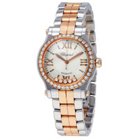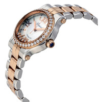 18 carat rose gold and stainless steel case with a 18 carat rose gold and stainless steel bracelet. Fixed diamond set bezel. Silver-toned dial with rose gold-tone hands and Roman numeral/index hour markers. Minute markers around the outer rim. Dial Type: Analog. Eco-drive movement. Scratch resistant sapphire crystal. Skeleton transparent exhibition see through case back. Case diameter: 30 mm. Round case shape. Folding clasp. Water resistant at 30 meters / 100 feet. Functions: hour, minute, second. Additional Info: five floating diamonds on dial. Luxury watch style. Watch label: Swiss Made. Chopard Happy Sport 18 Carat Rose Gold and Stainless Steel Ladies Watch 278573-6004. INFORMATION Brand: Chopard Series: Happy Sport Collection Name: Happy Sport Gender: Womens Model: 278573-6004 Watch Label: Swiss Made Movement: Automatic CASE Case Size: 30 mm Case Material: 18kt Rose Gold and Stainless Steel Case Shape: Round Case Back: Skeleton Transparent Exhibition See Through BAND Band Material: 18kt Rose Gold and Stainless Steel Band Type: Bracelet Band Color: Two-tone (Silver-tone and Rose Gold-tone) Clasp: Fold Over DIAL Dial Color: Silver-Toned Type: Analog Crystal: Scratch Resistant Sapphire Hands: Rose Gold-tone Dial Markers: Roman Numeral/Index Second Markers: Minute Markers around the outer rim Bezel: Fixed Diamond Set FEATURES Water Resistance: 30 meters / 100 feet Functions: Hour, Minute, Second Watch Features: Diamond, Stainless Steel, Gold, Analog ADDITIONAL INFO Watch Style: Luxury Warranty: 2 Year Jomashop Warranty Additional Info: Five floating diamonds on dial Jomashop Sku: CP278573-6004 Item Variation: 278573 6004, 278573.6004, 2785736004 Department: Watches Category: Watches