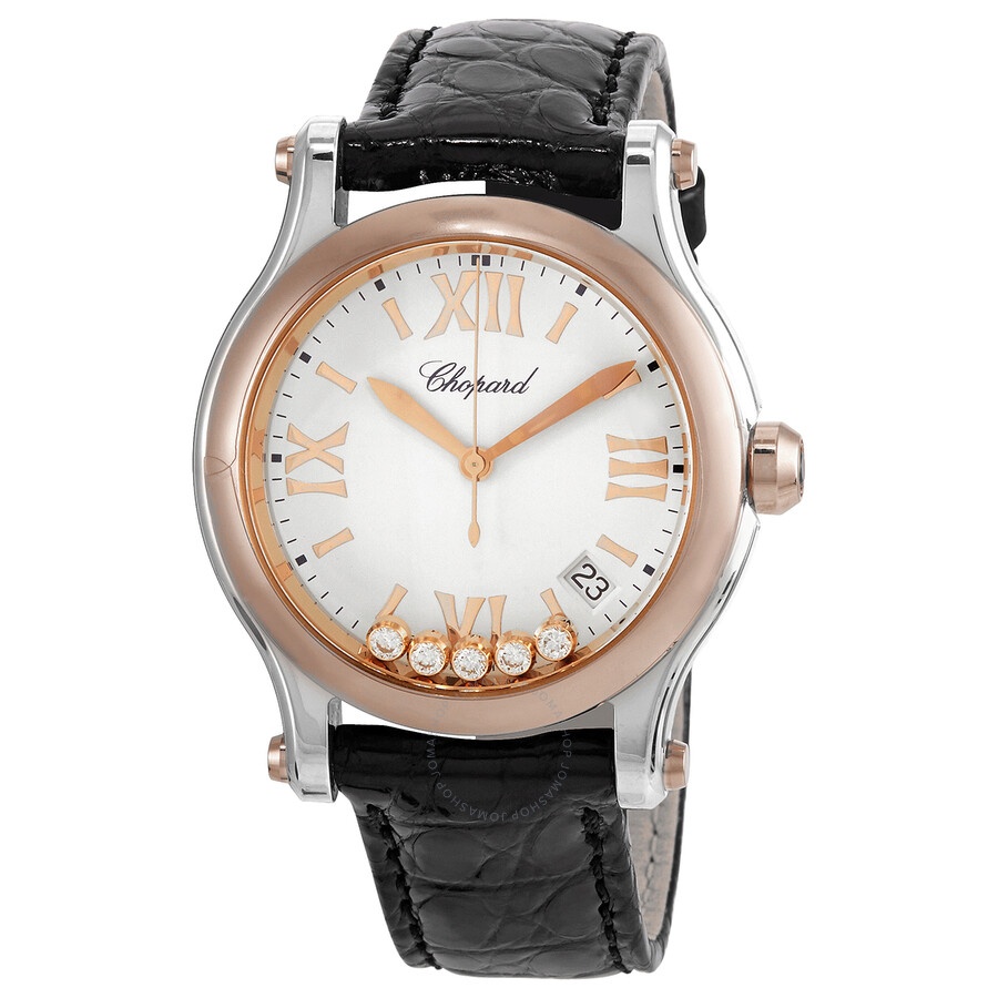 Stainless steel case with a black rubber strap. Fixed 18kt rose gold bezel. White dial (with five floating diamonds) with silver-tone hands and index-Roman numerals hour markers. Roman numerals mark the 3, 6, 9 and 12 o'clock positions, minute markers around the outer rim. Dial Type: Analog. Date display between the 4 and 5 o'clock positions. Quartz movement. Scratch resistant sapphire crystal. Pull / push crown. Solid case back. Round case shape. Case size: 36 mm. Tang clasp. Water resistant at 30 meters / 100 feet. Functions: date, hour, minute, second. Additional Info: white diamond carat: 0.24. Happy Sport Series. Luxury watch style. Watch label: Swiss Made. Chopard Happy Sport 18kt Rose Gold Steel Case Ladies Watch 278582-6001. CASE Case Size: 36 mm Case Material: Stainless Steel Case Shape: Round Case Back: Solid BAND Band Material: Rubber Band Type: Strap Band Color: Black Clasp: Tang DIAL Dial Color: White (with Five Floating Diamonds) Type: Analog Crystal: Scratch Resistant Sapphire Hands: Rose Gold-tone Dial Markers: Index-Roman Numerals Second Markers: Roman Numerals mark the 3, 6, 9 and 12 o'clock positions, Minute Markers around the outer rim Bezel: Fixed Bezel Color: Rose Gold-tone Bezel Material: 18kt Rose Gold Crown: Pull / Push INFORMATION Brand: Chopard Series: Happy Sport Collection Name: Happy Sport Gender: Womens Model: 278582-6001 Watch Label: Swiss Made Movement: Quartz FEATURES Water Resistance: 30 meters / 100 feet Calendar: Date display between the 4 and 5 o'clock positions Functions: Date, Hour, Minute, Second Watch Features: Diamond, Stainless Steel, Rubber, Gold, Analog ADDITIONAL INFO Watch Style: Luxury Warranty: 2 Year Jomashop Warranty Additional Info: White Diamond Carat: 0.24 Jomashop Sku: CP278582-6001 Department: Watches Category: Watches