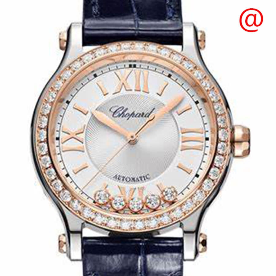Silver-tone stainless steel case with a blue alligator leather strap. Fixed 18kt rose gold bezel set with diamonds. Silver dial with rose gold hands and index-Roman numeral hour markers. Minute markers around the outer rim. Roman numeral marker appears at the 3, 6, 9 and 12 o'clock positions. Dial Type: Analog. Chopard Calibre 09.01-C Automatic movement, containing 27 Jewels, bitting at 25200 vph, and has a power reserve of approximately 42 hours. Scratch resistant sapphire crystal. Pull / push crown. Transparent case back. Round case shape, case size: 33 mm, case thickness: 10.84 mm. Tang clasp. Water resistant at 30 meters / 100 feet. Functions: hour, minute, second, chronometer. Additional Info: 5 floating diamonds on a silver dial. Happy Sport Series. Luxury watch style. Watch label: Swiss Made. Chopard Happy Sport Automatic Chronometer Diamond Silver Dial Ladies Watch 278608-6003. CASE Case Size: 33 Case Thickness: 10.84 mm Case Material: Stainless Steel Case Shape: Round Case Back: Transparent BAND Band Material: Alligator Leather Band Type: Strap Band Color: Blue Clasp: Tang DIAL Dial Color: Silver Type: Analog Crystal: Scratch Resistant Sapphire Hands: Rose Gold Dial Markers: Index-Roman Numeral Second Markers: Minute Markers around the outer rim. Roman Numeral Marker appears at the 3, 6, 9 and 12 o'clock positions Bezel: Fixed Bezel Material: 18kt Rose Gold set with Diamonds Crown: Pull / Push INFORMATION Brand: Chopard Series: Happy Sport Collection Name: Happy Sport Gender: Womens Model: 278608-6003 Watch Label: Swiss Made Movement: Automatic Engine: Chopard Calibre 09.01-C Power Reserve: 42 hours FEATURES Water Resistance: 30 meters / 100 feet Functions: Hour, Minute, Second, Chronometer Watch Features: Alligator Leather, Analog, Chronometer, Gold, Leather, Stainless Steel, Diamond ADDITIONAL INFO Watch Style: Luxury Warranty: 2 Year Jomashop Warranty Additional Info: 5 Floating Diamonds on a Silver Dial Jomashop Sku: CP278608-6003 Department: Watches Category: Watches