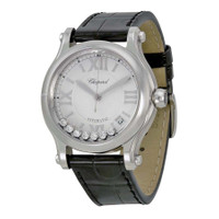 Stainless steel case with a black (alligator) leather strap. Fixed stainless steel bezel. Silver dial with 7 floating diamonds with silver-tone sword-shaped hands and index hour markers. Roman numerals mark the 3, 6, 9 and 12 o'clock positions. Minute markers around the outer rim. Dial Type: Analog. Date display between 4 and 5 o'clock position. Sellita calibre SW 300-1 automatic movement, based upon Sellita SW 300, containing 25 Jewels, bitting at 28800 vph, and has a power reserve of approximately 38 hours. Scratch resistant sapphire crystal. Pull / push crown. Skeleton case back. Round case shape. Case size: 36 mm. Case thickness: 12.3 mm. Band width: 17.8 mm, band length: 7 inches. Tang clasp. Water resistant at 30 meters / 100 feet. Functions: date, hour, minute, second. Happy sport series. Luxury watch style. Watch label: Swiss Made. Item Variations: 278559 3001, 278559.3001, 2785593001. Chopard Happy Sport Automatic Silver Dial Ladies Watch 278559-3001. INFORMATION Brand: Chopard Series: Happy Sport Collection Name: Happy Sport Gender: Womens Model: 278559-3001 Watch Label: Swiss Made Movement: Automatic Engine: Sellita Calibre SW 300-1 Power Reserve: 42 hours CASE Case Size: 36 mm Case Thickness: 12.3 mm Case Material: Stainless Steel Case Shape: Round Case Back: Skeleton BAND Band Material: (Alligator) Leather Band Type: Strap Band Color: Black Band Length: 7 inches Band Width: 17.8 mm Clasp: Tang DIAL Dial Color: Silver with 7 Floating Diamonds Type: Analog Crystal: Scratch Resistant Sapphire Hands: Silver-tone Sword-shaped Dial Markers: Index Second Markers: Roman Numerals mark the 3, 6, 9 and 12 o'clock positions. Minute Markers around the outer rim Bezel: Fixed Bezel Color: Silver-tone Bezel Material: Stainless Steel Crown: Pull / Push FEATURES Water Resistance: 30 meters / 100 feet Calendar: Date display between 4 and 5 o'clock position Functions: Date, Hour, Minute, Second Watch Features: Diamond, Stainless Steel, Leather, Analog, Alligator Leather ADDITIONAL INFO Watch Style: Luxury Warranty: 2 Year Jomashop Warranty UPC Code: 845960056731 Jomashop Sku: CP278559-3001 Item Variation: 278559 3001, 278559.3001, 2785593001 Department: Watches Category: Watches