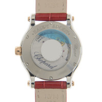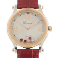 Silver-tone stainless steel case with a red alligator band. Fixed rose gold-tone 18kt rose gold bezel. Silver-tone dial with rose gold-tone hands and Roman numeral hour markers. Minute markers around the outer rim. Dial Type: Analog. Chopard Calibre 09.01-C Automatic movement, containing 27 Jewels, bitting at 25200 vph, and has a power reserve of approximately 42 hours. Scratch resistant sapphire crystal. Transparent see through case back. Round case shape, case size: 30 mm. Buckle clasp. Water resistant at 30 meters / 100 feet. Functions: hour, minute, second. Happy Sport Series. Luxury watch style. Watch label: Swiss Made. Chopard Happy Sport Automatic Silver Dial Ladies Watch 278573-6026. INFORMATION Brand: Chopard Series: Happy Sport Collection Name: Happy Sport Gender: Womens Model: 278573-6026 Watch Label: Swiss Made Movement: Automatic Engine: Chopard Calibre 09.01-C Power Reserve: 42 hours CASE Case Size: 30 mm Case Material: Stainless Steel Case Shape: Round Case Back: Transparent See Through BAND Band Material: Alligator Band Type: Strap Band Color: Red Clasp: Buckle DIAL Dial Color: Silver-tone Type: Analog Crystal: Scratch Resistant Sapphire Hands: Rose Gold-tone Dial Markers: Roman Numeral Second Markers: Minute Markers around the outer rim Bezel: Fixed Bezel Color: Rose Gold-tone Bezel Material: 18kt Rose Gold FEATURES Water Resistance: 30 meters / 100 feet Functions: Hour, Minute, Second Watch Features: Stainless Steel, Gold, Analog, Alligator Leather ADDITIONAL INFO Watch Style: Luxury Warranty: 2 Year Jomashop Warranty Jomashop Sku: CP2785736026 Department: Watches Category: Watches