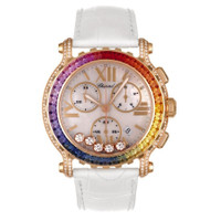 Rose gold-tone case with a white alligator leather strap. Fixed bezel with diamond set 18kt rose gold. White dial with rose gold-tone hands and Arabic numeral & index hour markers. Minute markers around the outer rim. Dial Type: Analog. Luminescent hands. Date display between 4 and 5 o'clock position. Quartz movement. Scratch resistant sapphire crystal. Round case shape, case size: 42 mm. Functions: chronograph, date, hour, minute, second. Happy Sport Chrono Series. Dress watch style. Watch label: Swiss Made. Item Variations: 283582 5015, 283582.5015, 2835825015. Chopard Happy Sport Chrono Chronograph Quartz Diamond White Dial Ladies Watch 283582-5015. INFORMATION Brand: Chopard Series: Happy Sport Chrono Collection Name: Happy Sport Chrono Gender: Womens Model: 283582-5015 Watch Label: Swiss Made Movement: Quartz CASE Case Size: 42 mm Case Shape: Round BAND Band Material: Alligator Leather Band Type: Strap Band Color: White DIAL Dial Color: White Type: Analog Crystal: Scratch Resistant Sapphire Hands: Rose Gold-tone Dial Markers: Arabic Numeral & Index Second Markers: Minute Markers around the outer rim Luminiscence: Hands Bezel: Fixed Bezel Material: Diamond Set 18kt Rose Gold FEATURES Calendar: Date display between 4 and 5 o'clock position Functions: Chronograph, Date, Hour, Minute, Second Watch Features: Alligator Leather, Analog, Gold, Leather, Chronograph, Diamond ADDITIONAL INFO Watch Style: Dress Warranty: 2 Year Jomashop Warranty Jomashop Sku: CP283582-5015 Item Variation: 283582 5015, 283582.5015, 2835825015 Department: Watches Category: Watches