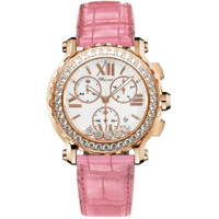 18kt rose gold case with a pink leather bracelet. Bezel set with diamonds. White dial with 5 floating diamonds and luminous hands. Index hour markers. Minute markers around the outer rim. Date display appears between the 4 and 5 o'clock position. Three: 1/10 seconds, 30 minutes, 60 seconds sub-dials. Quartz movement. Scratch resistant sapphire crystal. Case diameter: 42 mm. Case thickness: 12.50 mm. Tang clasp. Water resistant at 30 meters/ 100 feet. Functions: hours, minutes, seconds, date, chronograph. Chopard Happy Sport Chrono Ladies Watch 283583-5001. GENERAL Color: Gold / Pink / Rose / White INFORMATION Brand: Chopard Series: Happy Sport Collection Name: HAPPY SPORT Gender: Womens Model: 283583-5001 Watch Label: Swiss Made Movement: Quartz CASE Case Size: 42 mm Case Thickness: 12.5 mm Case Material: 18kt Rose Gold Case Shape: Round BAND Band Material: Leather Band Type: Strap Band Color: Pink Clasp: Tang DIAL Dial Color: White dial with 5 floating diamonds Type: Analog Crystal: Scratch Resistant Sapphire Hands: Luminous Dial Markers: Index Second Markers: Minute Markers Around The Outer Rim Sub Dials: Three - 1/10 Second, 30 Minute, 60 Second Bezel: Set With Diamonds FEATURES Water Resistance: 30 meters / 100 feet Calendar: Date display between 4 and 5 o'clock position Functions: Hours, Minutes, Seconds, Date, Chronograph Watch Features: Diamond, Chronograph, Leather, Gold, Analog ADDITIONAL INFO Watch Style: Luxury Warranty: 2 Year Jomashop Warranty Jomashop Sku: CP283583-5001 Item Variation: 283583 5001, 283583.5001, 2835835001 Department: Watches Category: Watches