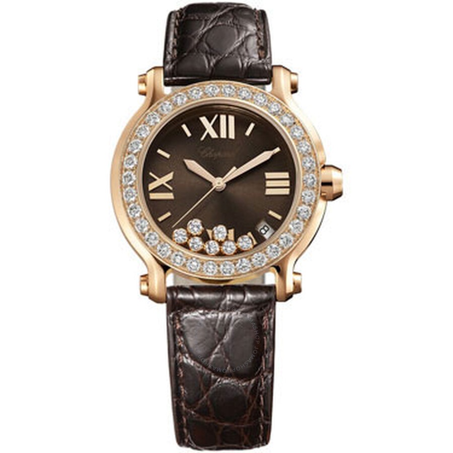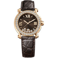 18k rose gold case with a brown crocodile leather strap. 18k rose gold with 34 diamonds (1.87 cts) bezel. Brown dial with rose gold-tone hands and stick hour markers. Roman numerals mark the 3, 6, 9 and 12 o'clock positions. Dial Type: Analog. Date display appears between the 4 and 5 o'clock positions. Quartz movement. Scratch resistant sapphire crystal. Solid case back. Case diameter: 36 mm. Round case shape. Band width: 20 mm. Tang clasp. Water resistant at 30 meters / 100 feet. Functions: date, hour, minute, second. Luxury watch style. Watch label: Swiss Made. Chopard Happy Sport Diamond Brown Dial 18k Rose Gold Ladies Watch 277473-5008. GENERAL Color: Brown / Gold / Rose INFORMATION Brand: Chopard Series: Happy Sport Collection Name: Happy Sport Gender: Womens Model: 277473-5008 Watch Label: Swiss Made Movement: Quartz CASE Case Size: 36 mm Case Material: 18kt Rose Gold Case Shape: Round Case Back: Solid BAND Band Material: Crocodile Leather Band Type: Strap Band Color: Brown Band Width: 20 mm Clasp: Tang DIAL Dial Color: Brown Type: Analog Crystal: Scratch Resistant Sapphire Hands: Rose Gold-tone Dial Markers: Stick Second Markers: Roman numerals mark the 3, 6, 9 and 12 o'clock positions Bezel: 18k Rose Gold with 34 diamonds (1.87 cts) FEATURES Water Resistance: 30 meters / 100 feet Calendar: Date display between 4 and 5 o'clock position Functions: Date, Hour, Minute, Second Watch Features: Diamond, Leather, Gold, Analog ADDITIONAL INFO Watch Style: Luxury Warranty: 2 Year Jomashop Warranty Jomashop Sku: CP277473-5008 Item Variation: 277473 5008, 277473.5008, 2774735008 Department: Watches Category: Watches