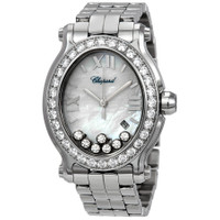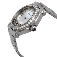 Stainless steel case with a stainless steel bracelet. Fixed stainless steel bezel set with diamonds. Mother of pearl dial featuring 7 floating diamonds with silver-tone hands and stick hour markers. Roman numerals mark the 3, 6, 9 and 12 o'clock positions. Dial Type: Analog. Date display between the 4 and 5 o'clock positions. Quartz movement. Scratch resistant sapphire crystal. Solid case back. Oval case shape. Case dimensions: 33.6 mm x 30.75 mm. Case thickness: 12.3 mm. Deployment clasp with a push button release. Water resistant at 50 meters / 165 feet. Functions: date, hour, minute, second. Luxury watch style. Watch label: Swiss Made. Chopard Happy Sport Diamond Mother of Pearl Dial Stainless Steel Ladies Watch 278546-3004. GENERAL Color: Mother of pearl INFORMATION Brand: Chopard Series: Happy Sport Collection Name: Happy Sport Gender: Womens Model: 27/8546-3004 Watch Label: Swiss Made Movement: Quartz CASE Case Size: 33.6 mm x 30.75 mm Case Thickness: 12.3 mm Case Material: Stainless Steel Case Shape: Oval Case Back: Solid BAND Band Material: Stainless Steel Band Type: Bracelet Band Color: Silver-tone Clasp: Deployment with Push Button Release DIAL Dial Color: Mother of Pearl featuring 7 Floating Diamonds Type: Analog Crystal: Scratch Resistant Sapphire Hands: Silver-tone Dial Markers: Stick Second Markers: Roman Numerals mark the 3, 6, 9 and 12 o'clock positions Bezel: Fixed Bezel Color: Silver-tone Bezel Material: Stainless Steel set with Diamonds FEATURES Water Resistance: 50 meters / 165 feet Calendar: Date display between the 4 and 5 o'clock positions Functions: Date, Hour, Minute, Second Watch Features: Diamond, Stainless Steel, Analog ADDITIONAL INFO Watch Style: Luxury Warranty: 2 Year Jomashop Warranty Jomashop Sku: CP278546-3004 Department: Watches Category: Watches