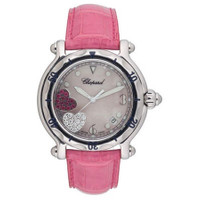 Stainless steel case with a pink croco-embossed leather bracelet. Fixed polished stainless steel bezel. Pink mother of pearl dial with luminous hands and dot silver-tone hour markers. Arabic numerals mark the 3, 6 and 9 o'clock positions. Two floating hearts set with 13 diamonds and 13 rubies inside dial. Minute markers around the outer rim. Date displays between the 4 and 5 o'clock position. Battery operated quartz movement. Scratch resistant sapphire crystal. Screw down crown. Solid case back. Case diameter: 38 mm. Case thickness: 12m m. Tang clasp. Water resistant at 30 meters / 100 feet. Chopard Happy Sport Diamond Ruby Heart Steel Pink Leather Ladies Watch 28/8950. GENERAL Color: Mother of pearl / Pink INFORMATION Brand: Chopard Series: Happy Hearts Collection Name: Happy Hearts Gender: Womens Model: 28/8950 Watch Label: Swiss Made Movement: Quartz CASE Case Size: 38 mm Case Thickness: 12 mm Case Material: Stainless Steel Case Shape: Round Case Back: Solid BAND Band Material: Leather Band Type: Strap Band Color: Pink Band Length: 7 inches Clasp: Tang DIAL Dial Color: Pink Mother of Pearl Type: Analog Crystal: Scratch Resistant Sapphire Hands: Luminous Dial Markers: Dot Silver-tone Hour Markers, Arabic Numerals mark the 3, 6 and 9 o'clock positions, Minute Markers around the outer rim Luminiscence: Hands and Dial Markers Bezel: Fixed Polished Stainless Steel Bezel Material: Stainless Steel Crown: Screw Down FEATURES Water Resistance: 30 meters / 100 feet Calendar: Date display between 4 and 5 o'clock position Functions: Hours/ Minutes/ Seconds/ Date Watch Features: Diamond, Stainless Steel, Leather, Analog ADDITIONAL INFO Watch Style: Dress Warranty: 2 Year Jomashop Warranty UPC Code: 845960003247 Additional Info: 2 Floating Hearts Set with 13 Diamonds and 13 Rubies Inside Dial Jomashop Sku: CP288950-3001 Item Variation: 28/8950 Department: Watches Category: Watches