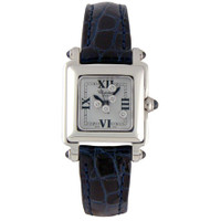 Stainless steel case with a black leather bracelet. Fixed bezel. White dial with 5 floating diamonds. Blue hands and blue Roman numerals hour markers. Quartz movement. Scratch resistant sapphire crystal. Blue sapphire cabochon crown. Tang clasp. Water resistant at 30 meters / 100 feet. Additional Info: sapphire cabochon crown; 4 sapphire cabochons on lugs. Chopard Happy Sport Diamond Steel Blue Ladies Watch 27/8892-23. GENERAL Box Type: Original Box Color: Black / Blue / White CASE Case Material: Stainless Steel Case Shape: Square BAND Band Material: Leather Band Type: Strap Band Color: Blue Band Length: 7 inches Clasp: Tang DIAL Dial Color: White with 5 floating diamonds Type: Analog Crystal: Scratch Resistant Sapphire Hands: Blue Dial Markers: Blue Roman Numerals Bezel: Fixed Bezel Material: Stainless Steel Crown: Blue Sapphire Cabochon INFORMATION Brand: Chopard Series: Happy Sport Square Collection Name: Happy Sport Square Gender: Womens Model: 27/8892-23 Watch Label: Swiss Made Movement: Quartz FEATURES Water Resistance: 30 meters / 100 feet Functions: Hours/ Minutes/ Seconds Watch Features: Analog, Leather, Stainless Steel, Diamond ADDITIONAL INFO Watch Style: Dress Warranty: 2 Year Jomashop Warranty Additional Info: Sapphire Cabochon Crown; 4 Sapphire Cabochons On Lugs Jomashop Sku: CP278892-23-WHT-DBL Item Variation: 27/8892-23 Department: Watches