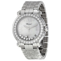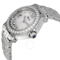 Stainless steel case with a stainless steel bracelet. Fixed 18kt white gold bezel set with 34 diamonds. Mother of pearl dial (with seven floating diamonds) with silver-tone sword-shaped hands and index hour markers. Roman numerals mark the 3, 6, 9 and 12 o'clkock positions. Dial Type: Analog. Date display between the 4 and 5 o'clock positions. Automatic movement with a 42-hour power reserve. Scratch resistant sapphire crystal. Pull / push set with a blue sapphire crown. Solid case back. Round case shape. Case size: 36 mm. Case thickness: 10.8 mm. Band width: 18 mm. Band length: 7.5 inches. Hidden fold over clasp. Water resistant at 30 meters / 100 feet. Functions: date, hour, minute, second. Happy Sport II Series. Luxury watch style. Watch label: Swiss Made. Item Variations: 278477 3009, 278477.3009, 2784773009. Chopard Happy Sport II Mother of Pearl Ladies Watch 278477-3009. INFORMATION Brand: Chopard Series: Happy Sport Ii Collection Name: Happy Sport II Gender: Womens Model: 278477-3009 Watch Label: Swiss Made Movement: Automatic Power Reserve: 42 hours CASE Case Size: 36 mm Case Thickness: 10.8 mm Case Material: Stainless Steel Case Shape: Round Case Back: Solid BAND Band Material: Stainless Steel Band Type: Bracelet Band Color: Silver-tone Band Length: 7.5 inches Band Width: 18 mm Clasp: Hidden Fold Over DIAL Dial Color: Mother of Pearl (with Seven Floating Diamonds) Type: Analog Crystal: Scratch Resistant Sapphire Hands: Silver-tone Sword-shaped Dial Markers: Index Second Markers: Roman Numerals mark the 3, 6, 9 and 12 o'clkock positions Bezel: Fixed Bezel Material: 18kt White Gold set with 34 Diamonds Crown: Pull / Push set with a Blue Sapphire FEATURES Water Resistance: 30 meters / 100 feet Calendar: Date display between 4 and 5 o'clock position Functions: Date, Hour, Minute, Second Watch Features: Diamond, Stainless Steel, Gold, Analog ADDITIONAL INFO Watch Style: Luxury Warranty: 2 Year Jomashop Warranty UPC Code: 845960059893 Jomashop Sku: CP278477-3009 Item Variation: 278477 3009, 278477.3009, 2784773009 Department: Watches Category: Watches